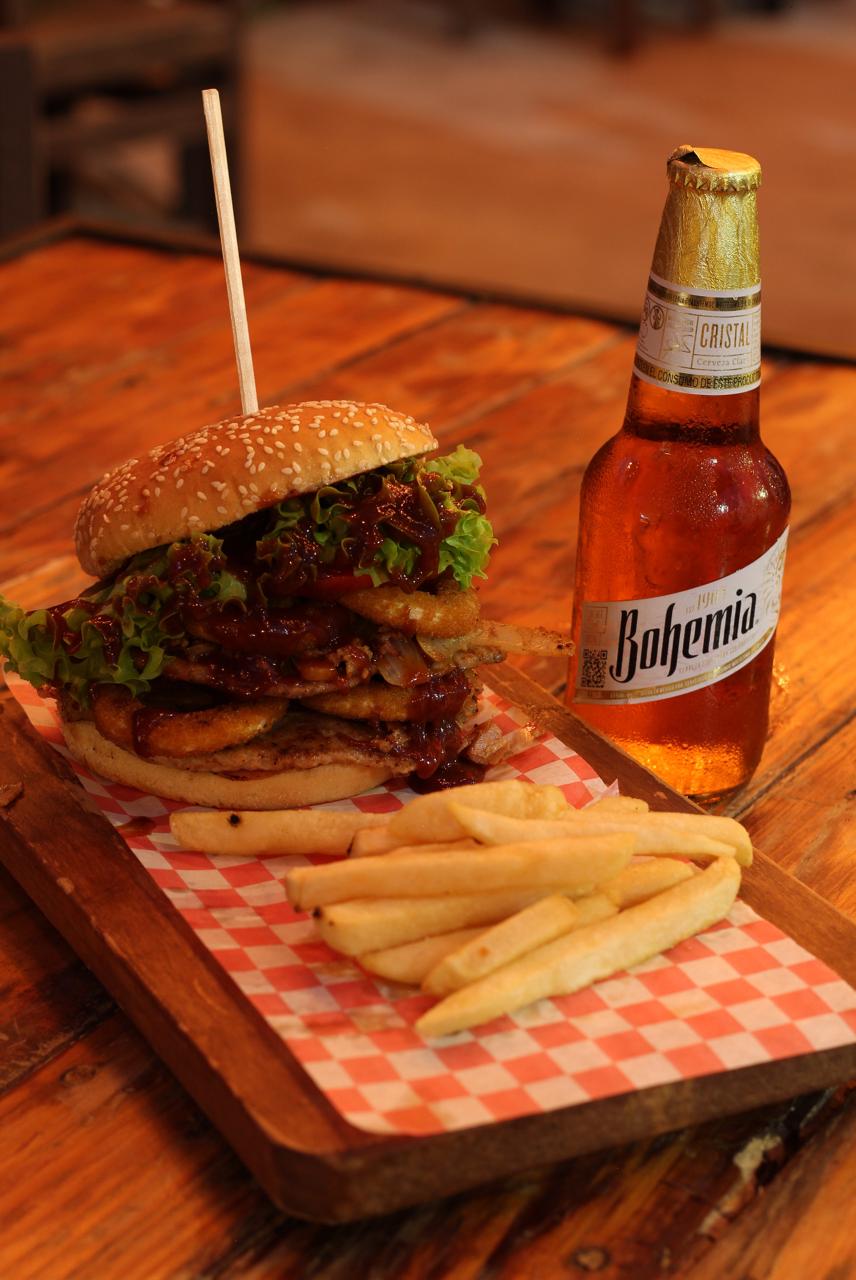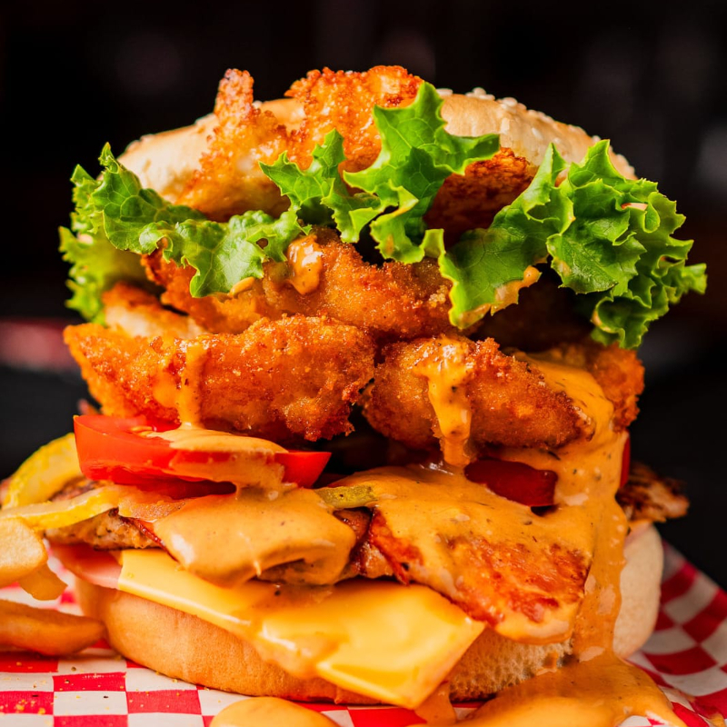 Incluye papas, una carne artesanal, tocino, 3 camarones empanizados rellenos de queso philadelphia, cebolla asada, queso asadero, jamón, queso amarillo, aderezo de chipotle, jitomate y lechuga.