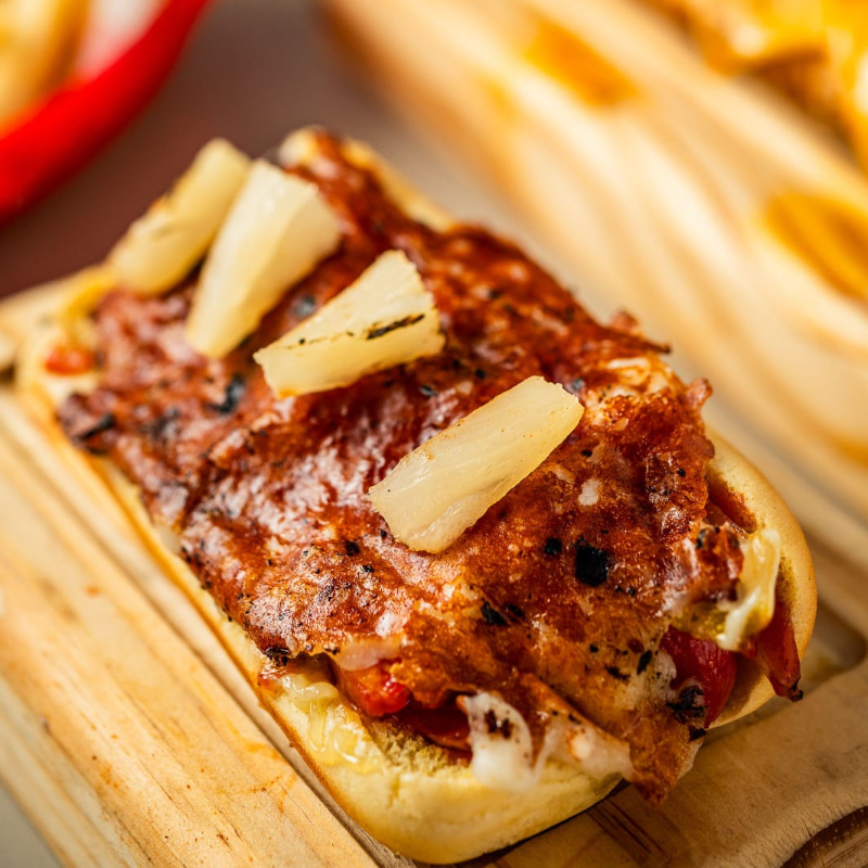 Salchicha de pavo, tocino, cátsup, mostaza, mayonesa, picante, jitomate, cebolla asada, piña y queso asadero.