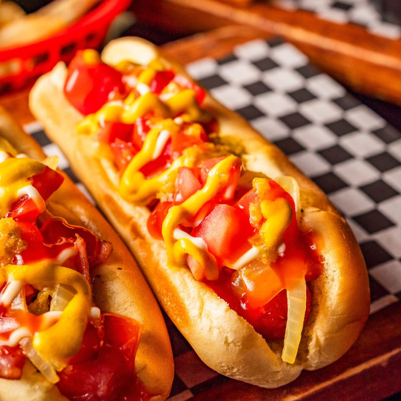 Salchicha de pavo, tocino, cátsup, mostaza, mayonesa, picante, jitomate, cebolla asada.