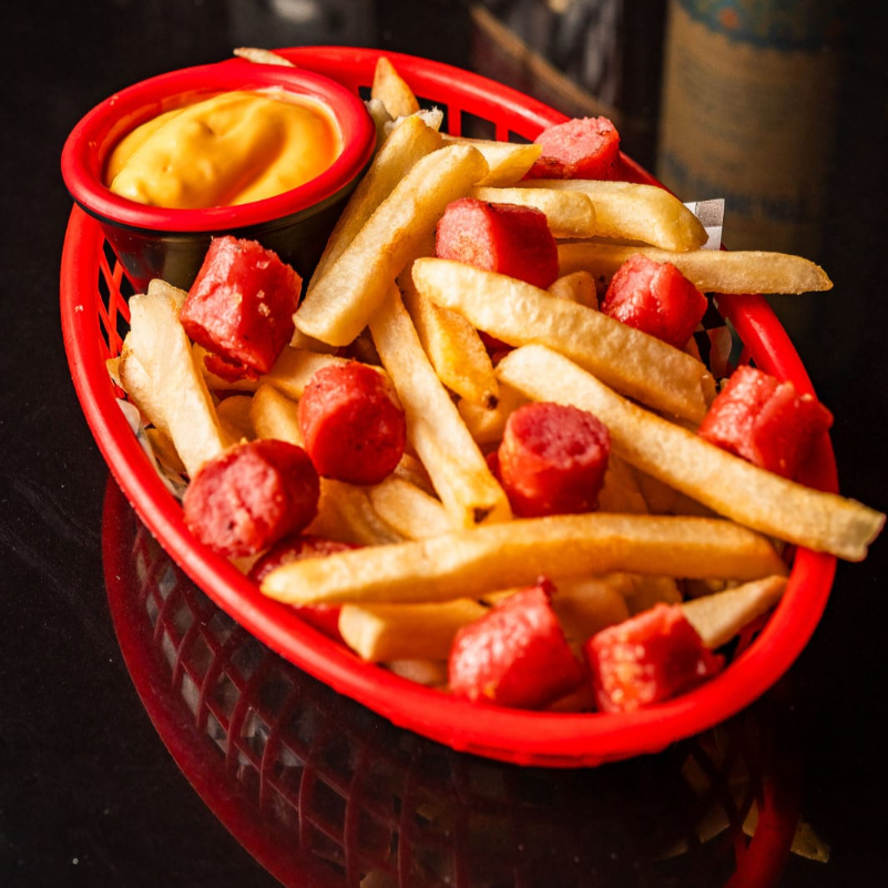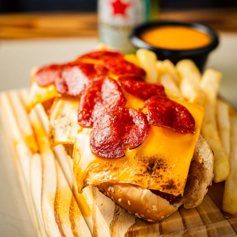 Salchicha de cerdo, tocino, cátsup, mostaza, mayonesa, picante, jitomate, cebolla queso americano (2), queso manchego (1), pepperoni (5).