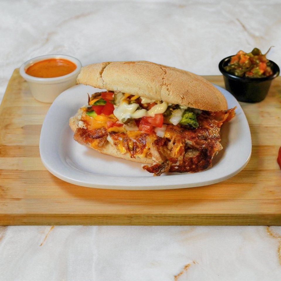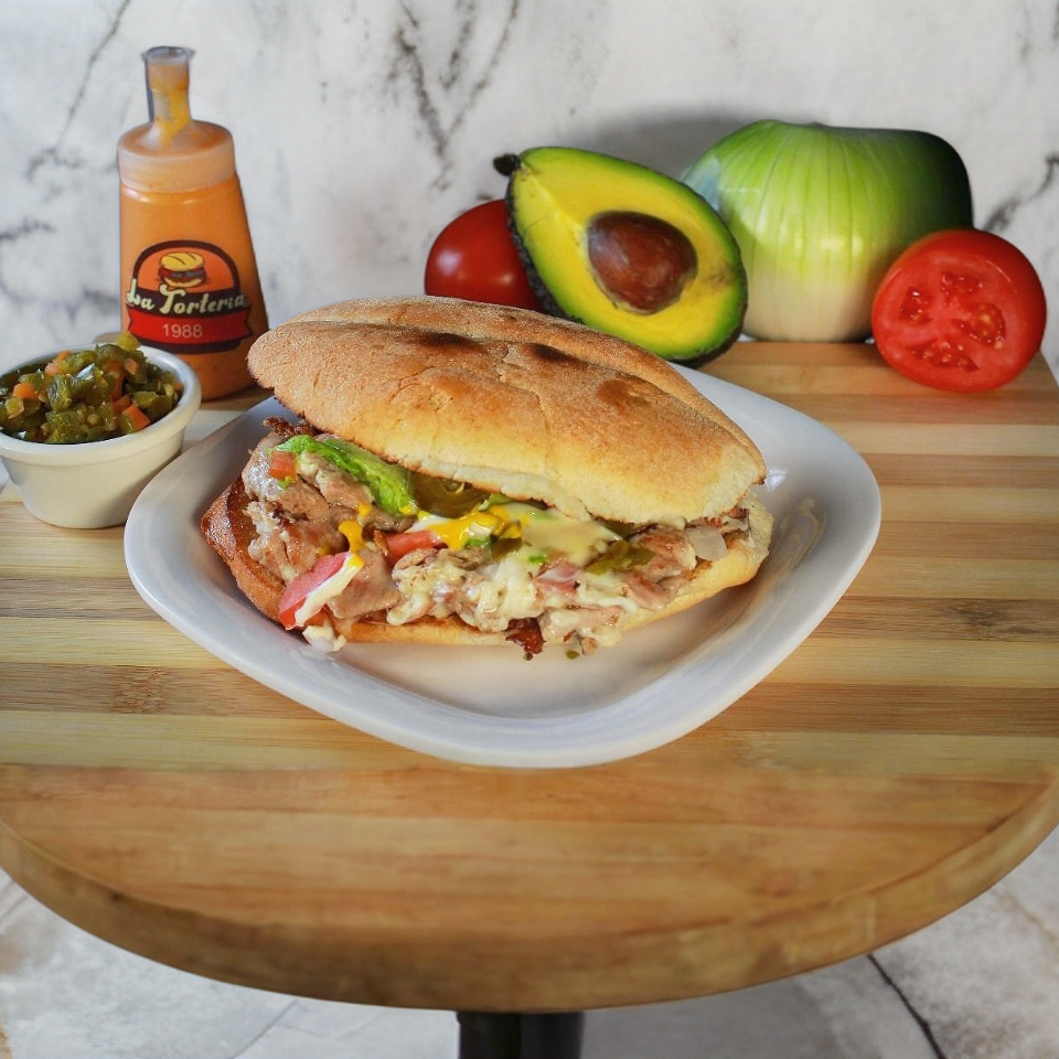 Pierna milanesa 2 quesos aguacate jitomate cebolla chile crema mostaza