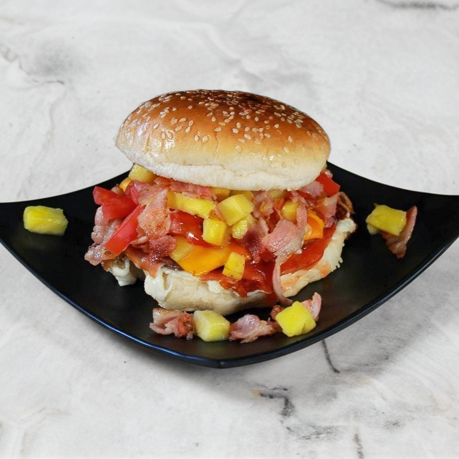Tocino queso amarillo piña jitomate cebolla chile crema mostaza catsup