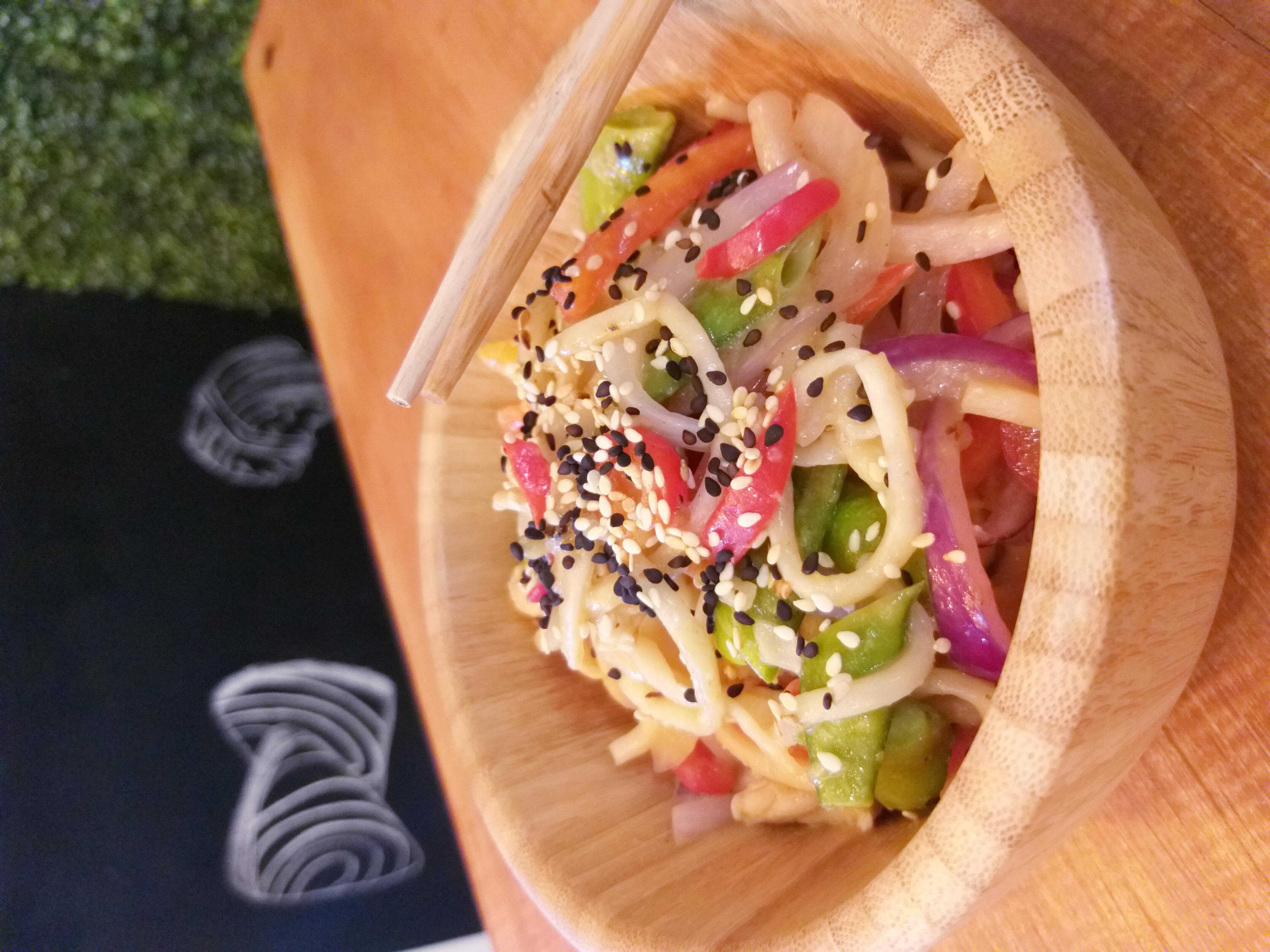 Arroz frito con verduras, res, pollo, camarón y soya.