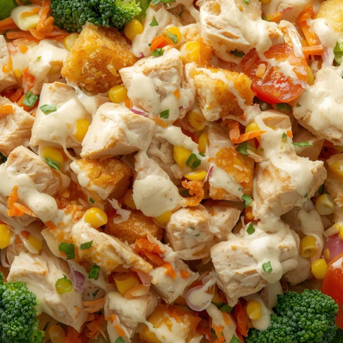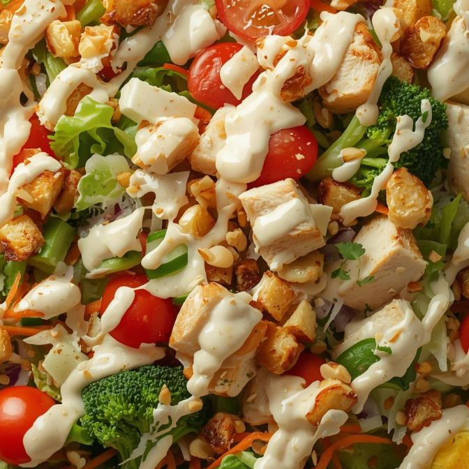 Una cama de lechuga fresca que aporta ligereza, acompañada de pollo jugoso y cacahuate salado que añade un toque crujiente. Los granos de elote y los tomates cherry brindan dulzura natural, mientras que la zanahoria rallada y el brócoli aportan color y frescura. Para coronar, crotones estilo italiano que dan ese toque tostado irresistible y un aderezo que une todos los ingredientes.