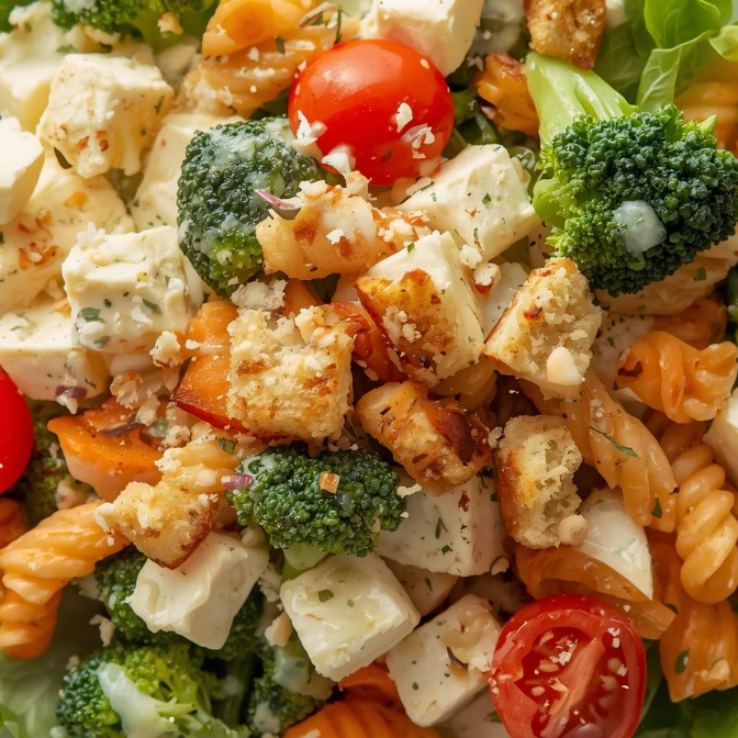 Una deliciosa ensalada servida sobre una cama de lechuga crujiente, acompañada de suaves cubitos de queso panela, jugosos tomates cherry, zanahoria rallada, pasta al dente y floretes de brócoli al vapor. Se corona con crotones estilo italiano que aportan un toque crujiente y se complementa con un aderezo al gusto que realza todos los sabores.