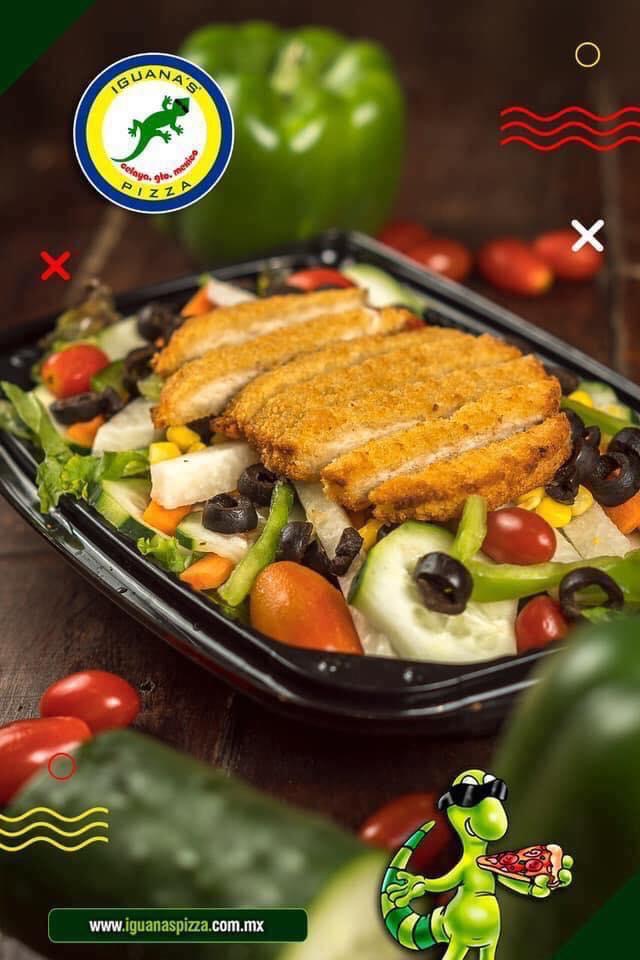 Lechuga, jitomate, pepino, elote, zanahoria, acelgas negras, pimiento y pollo en tiras
