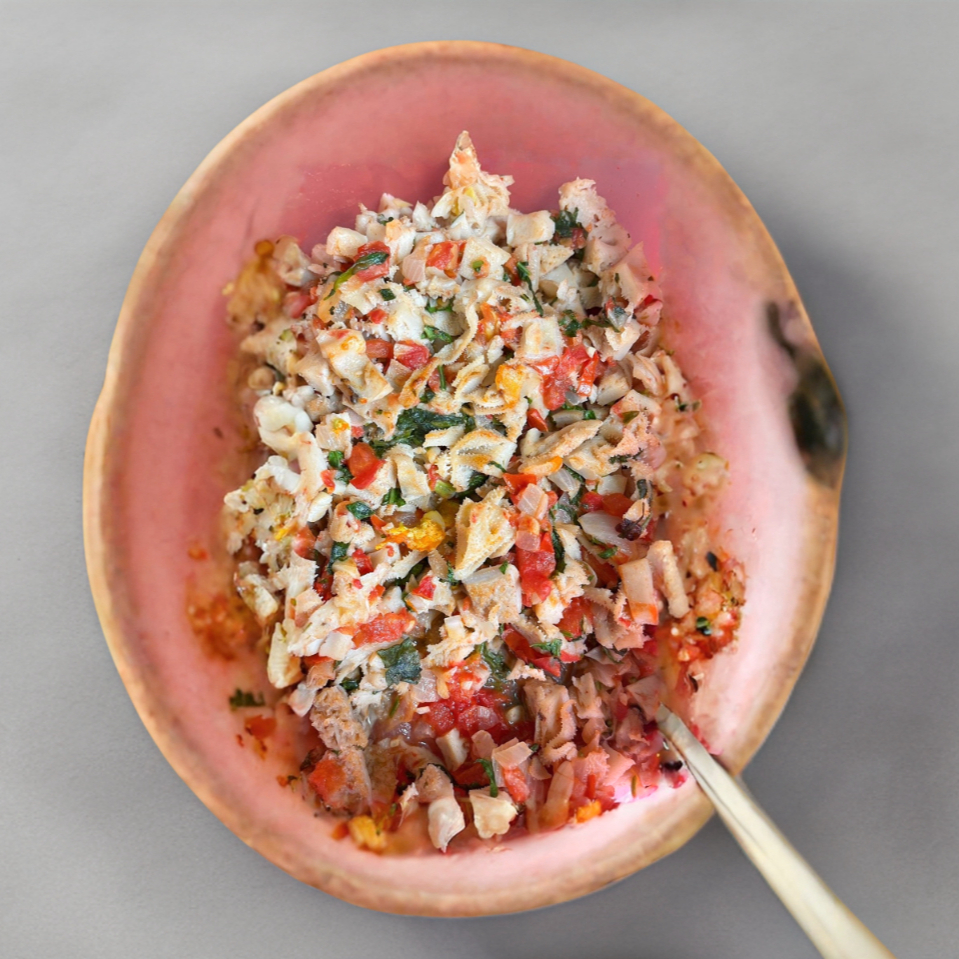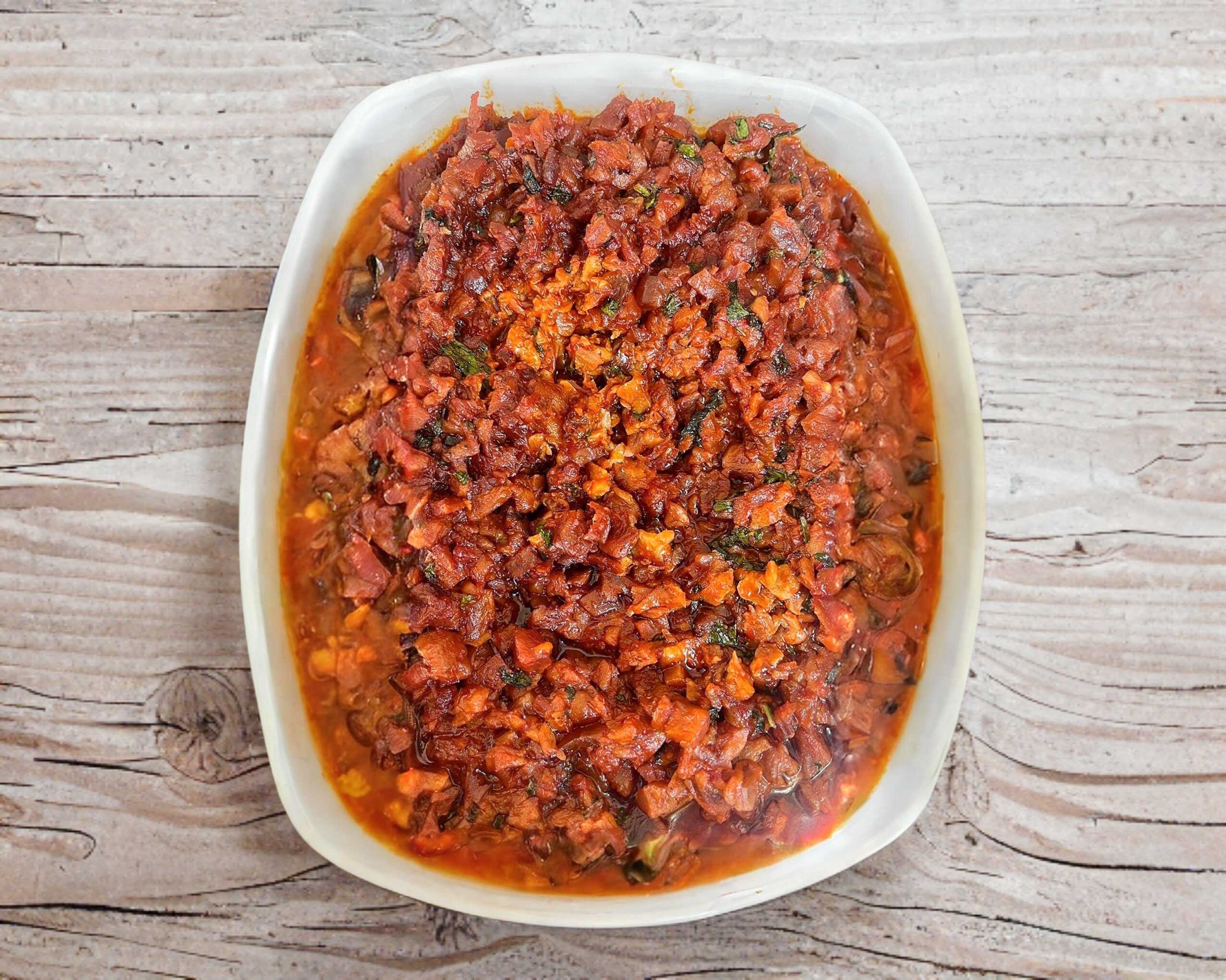 Carne pata de res cortada en trocitos preparados con cebolla, coliflor, oregano, y vinagre blanco