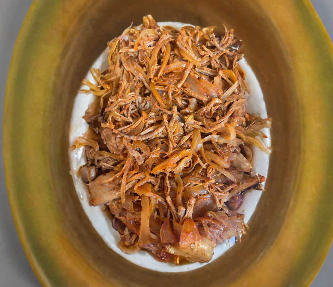 Flank steak, falda de res, deshebrada en salsa de jitomate y chipotle