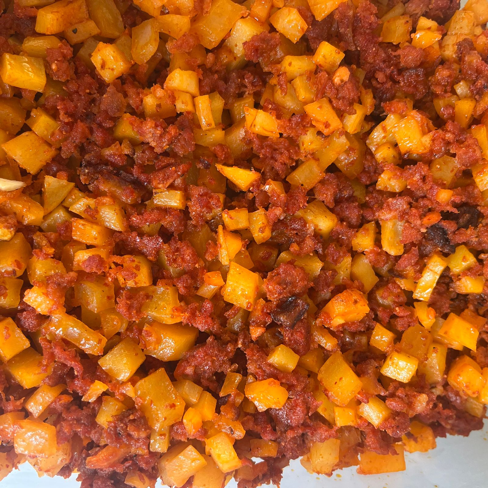 Papas cortadas en cubitos acompañados de chorizo especial