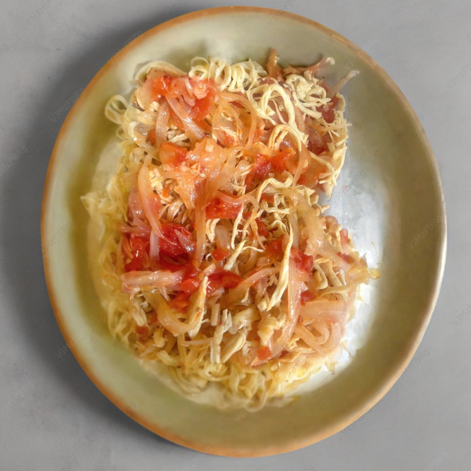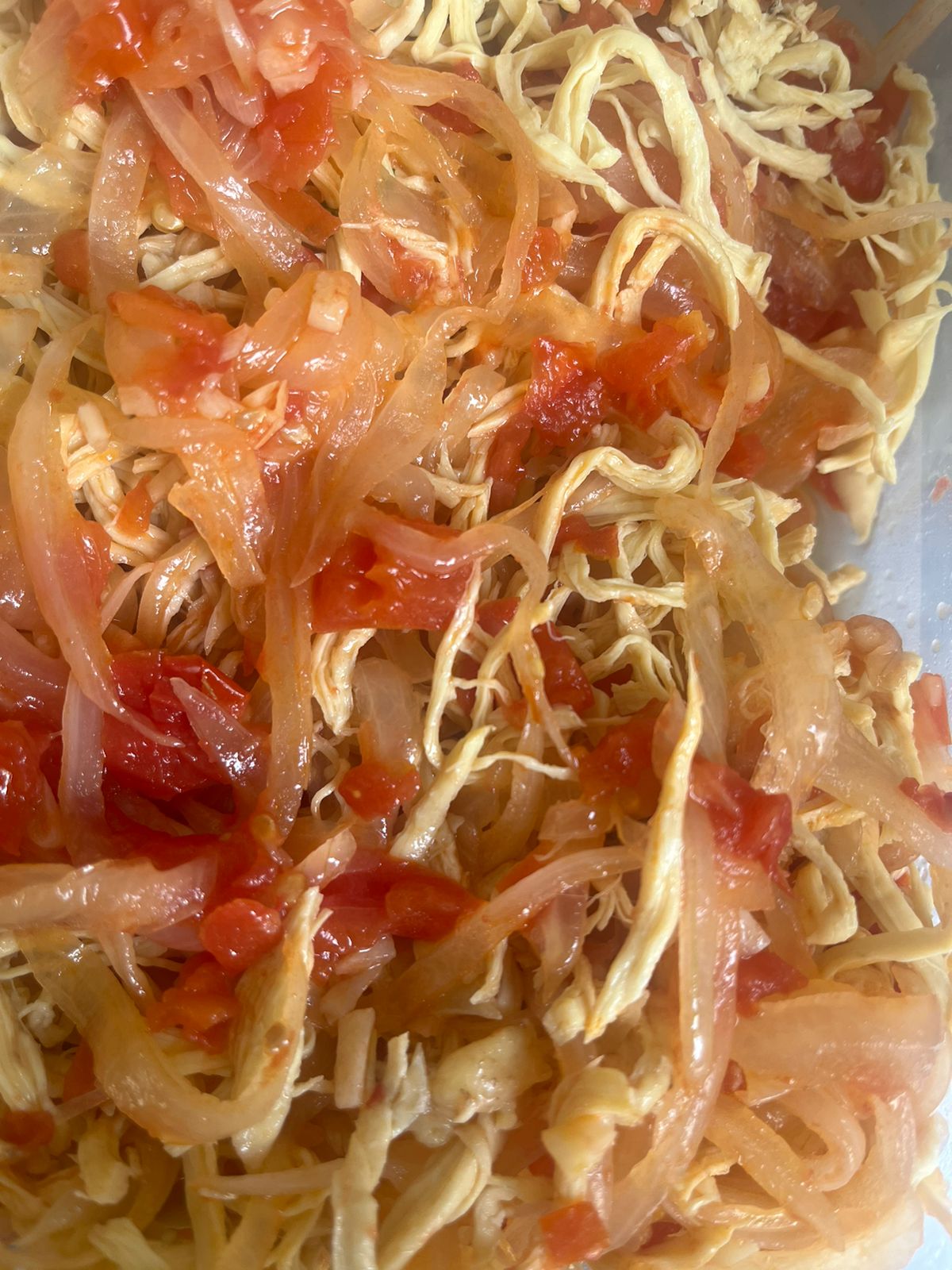 Pechuga de pollo deshebrada, acompañada con cebolla y jitomate