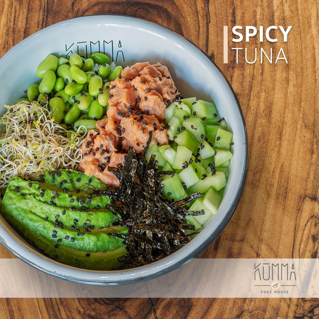 Poke de Arroz, spicy tuna, cebolla caramelizada, germen de alfalfa, edamames, aguacate, pepino, ajonjolí negro, alga nori, ponzu y chipotle mayo. Elige el tamaño.