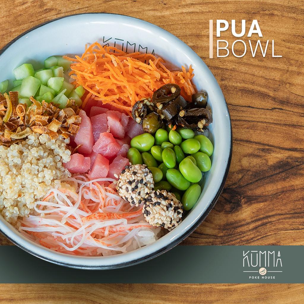 Poke de Quinoa, salmón horneado, edamames, aguacate, piña, pepino, furikake y ponzu.