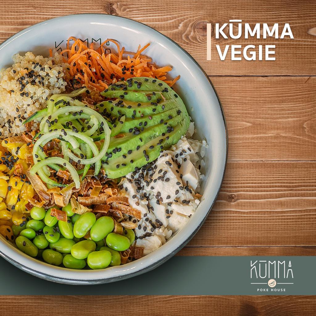 Poke de Quinoa, tofu, edamames, betabel, aguacate, jitomate cherry, cacahuate y ponzu.