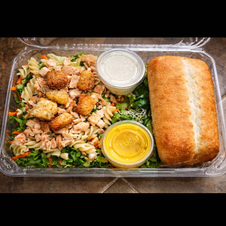 Media ensalada fresca con ingredientes seleccionados + una deliciosa Chapata recién preparada (Ambas preparadas de la misma proteína) + 1/2 litro de agua fresca para complementar tu comida. (Nuestro combo lleva como base Mix de lechugas)