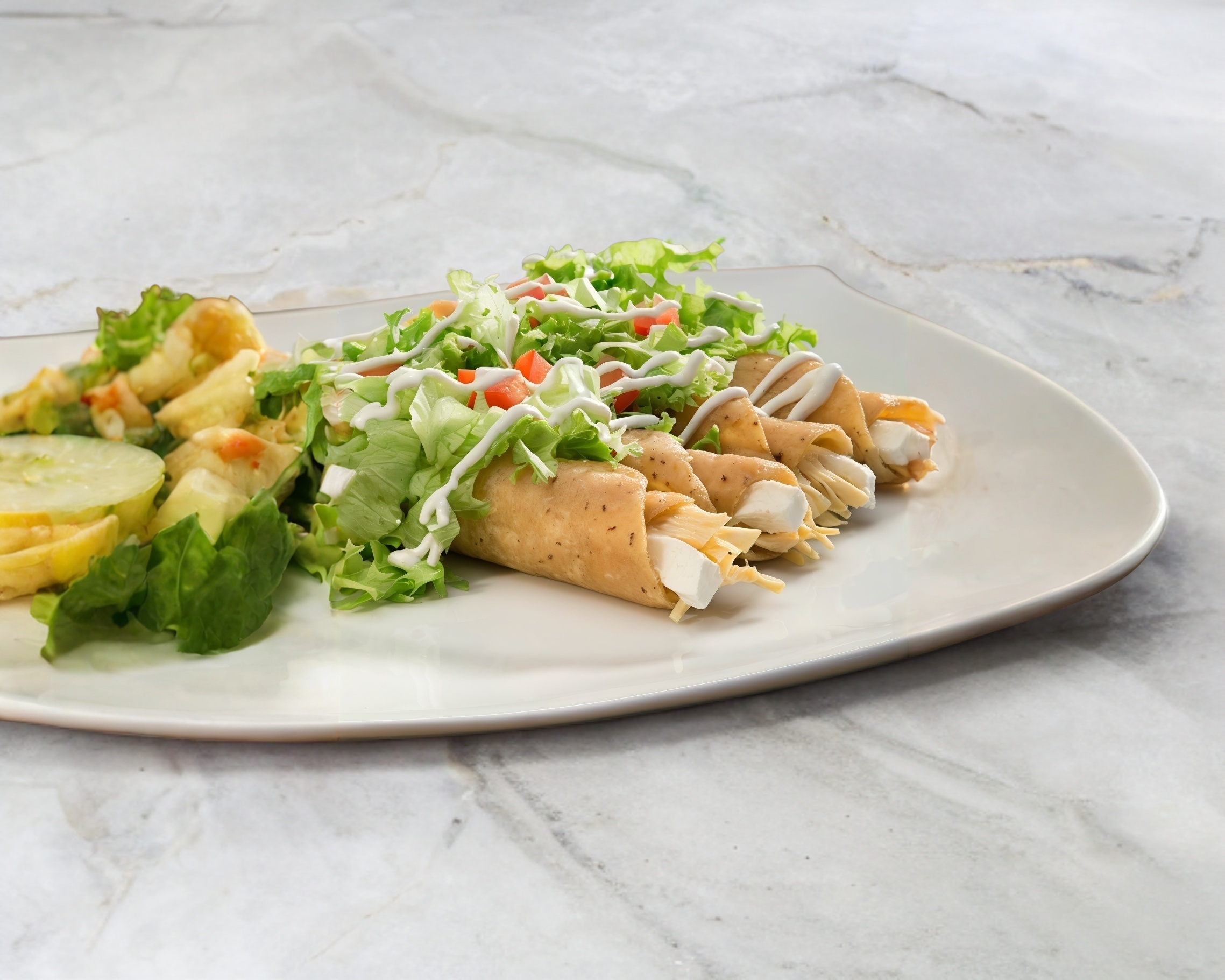 5 pzas. De tacos dorados de pechuga de pollo con ensalada, crema y queso