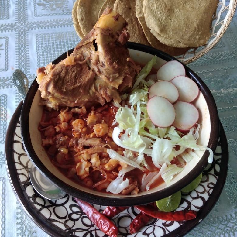 Se sirve en un vaso de 1 litro con maíz, caldo rojo y proteína al gusto. Incluye tostadas y verduras.