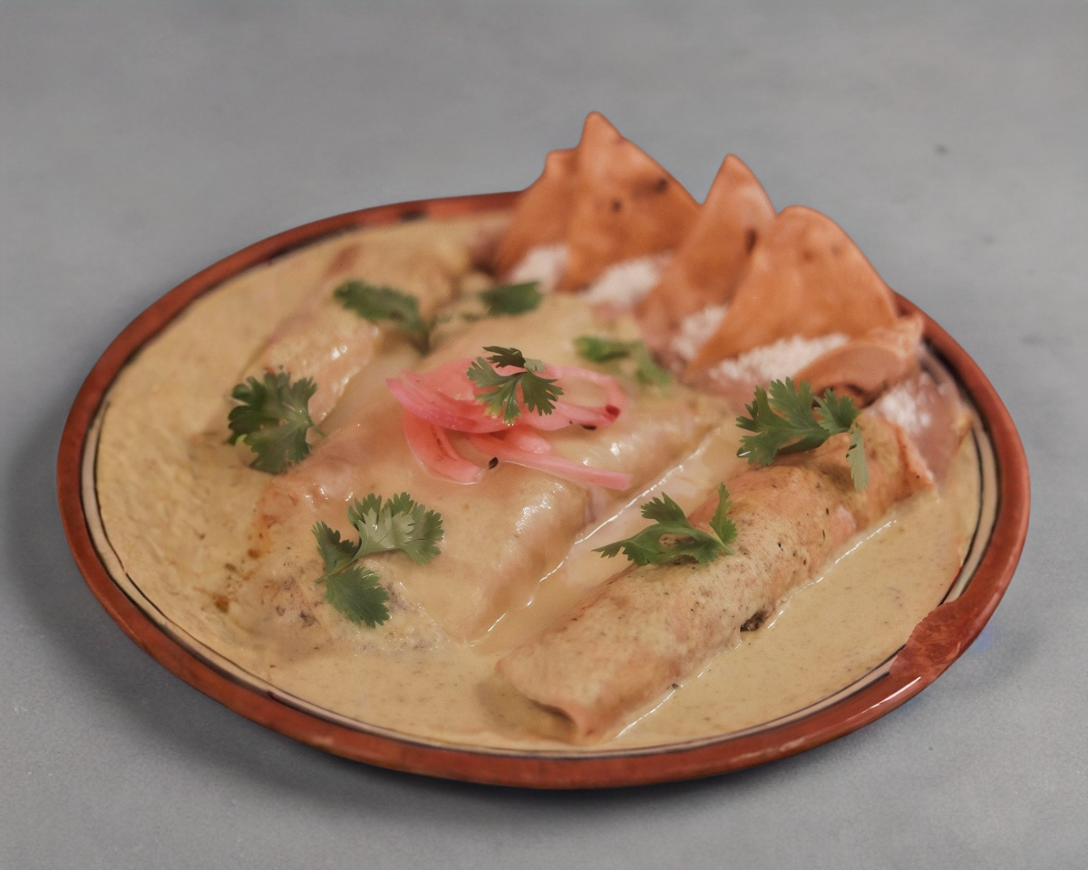 3 piezas rellenas de pollo, bañadas en salsa suiza y acompañadas de frijoles, queso crema y cebolla morada.