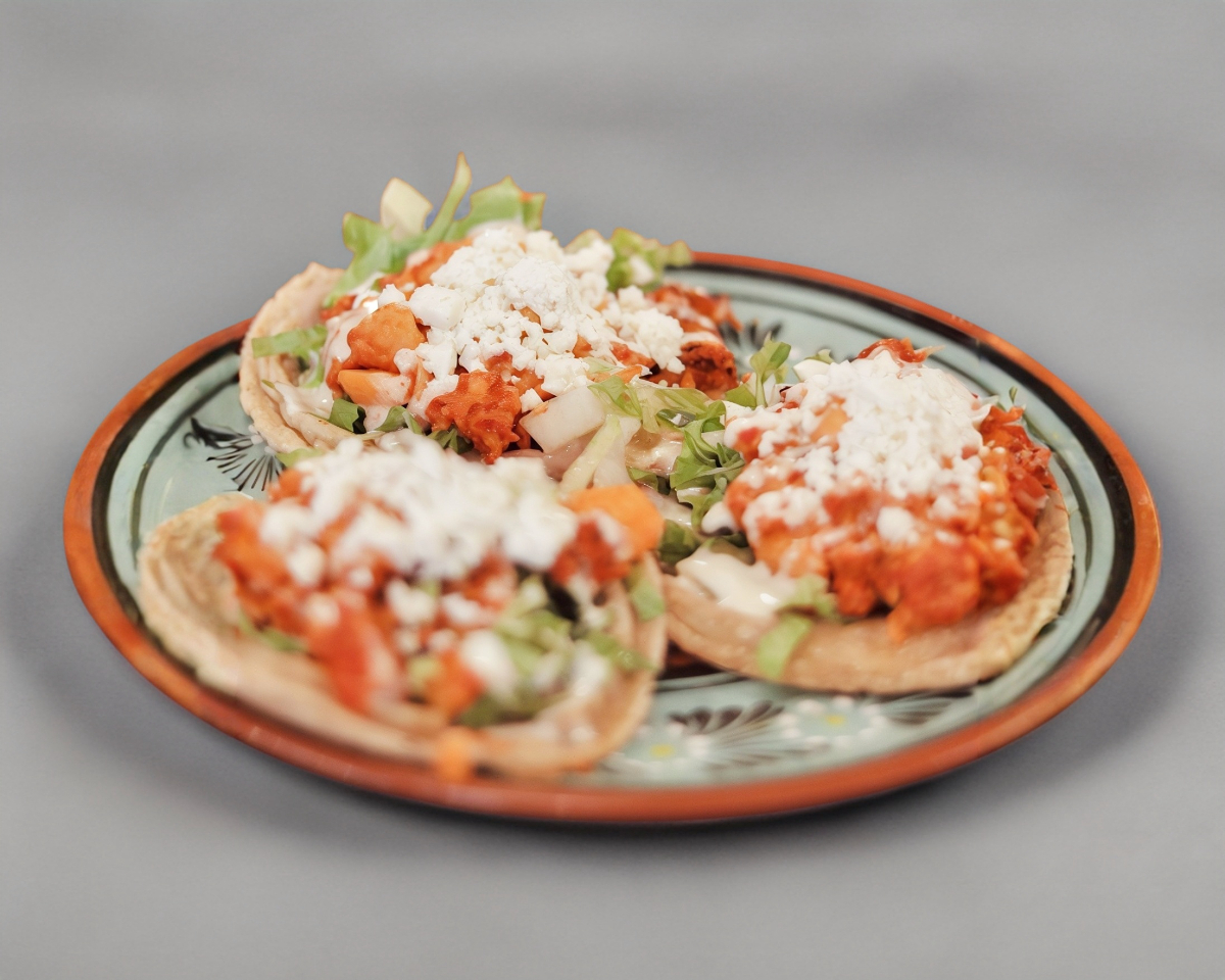 3 Sopes acompañados con frijoles, lechuga, queso y crema.