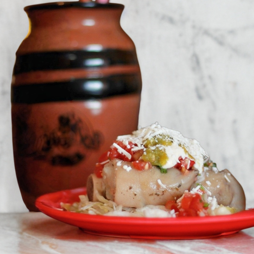 1 Patita de puerco con pico de gallo, encurtido, col y salsa de la casa.