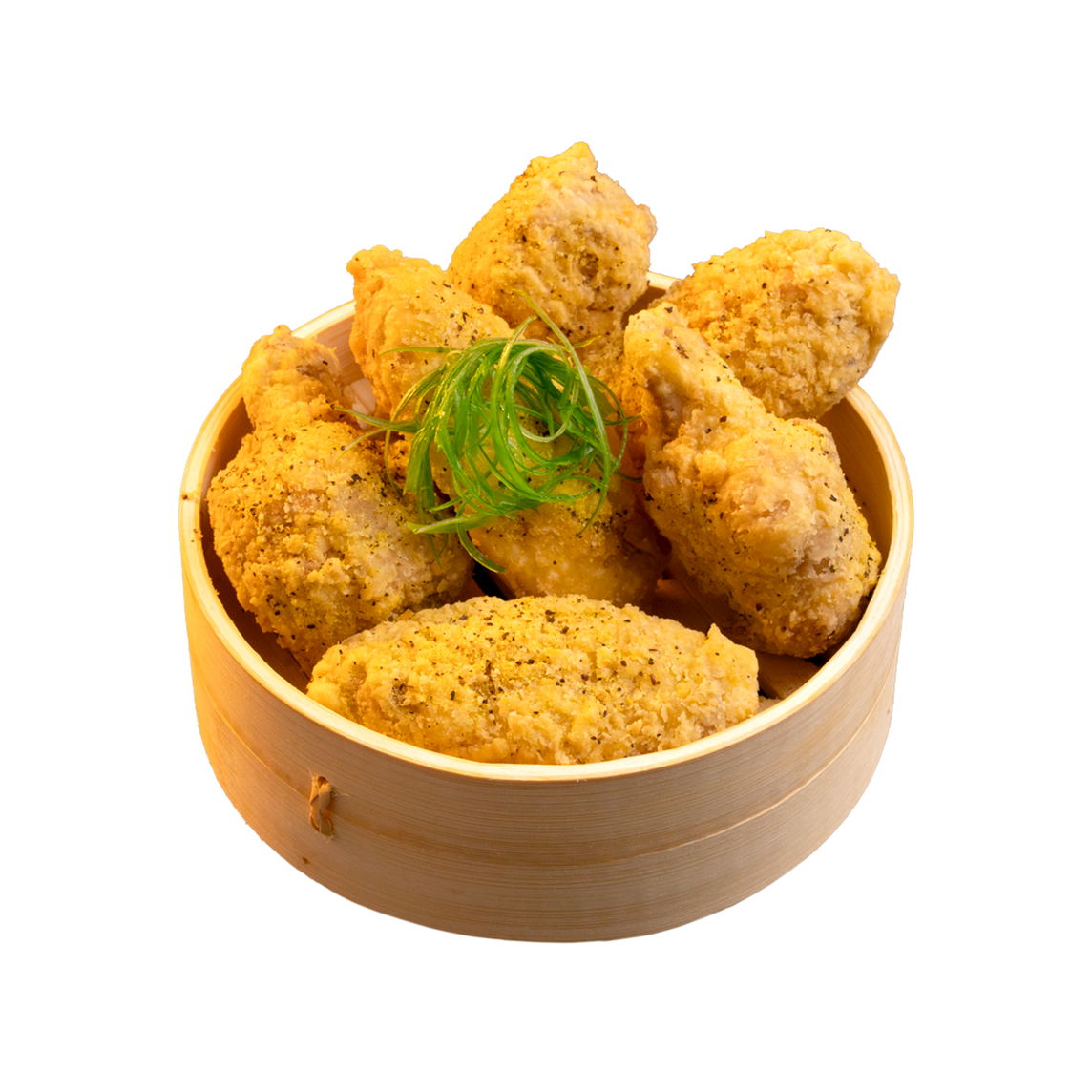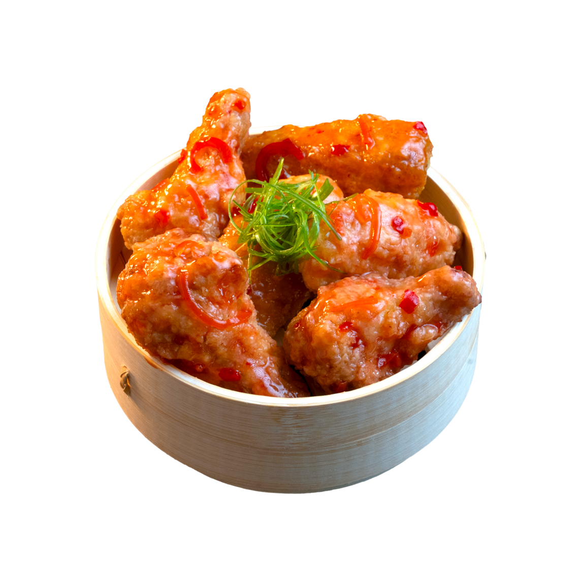 6 pzas Alitas fritas, bañadas con nuestra salsa panthai y acompañadas de cebollín.