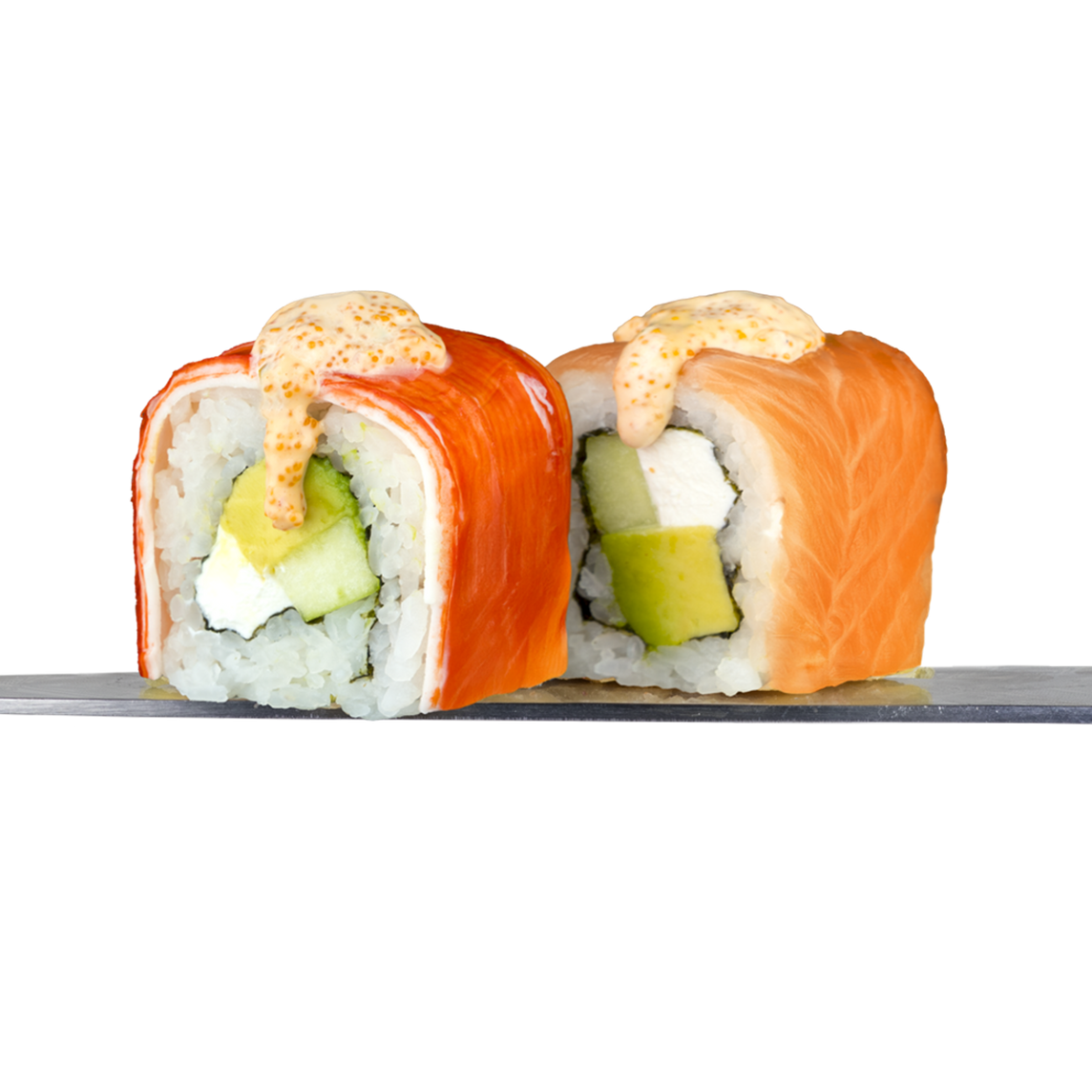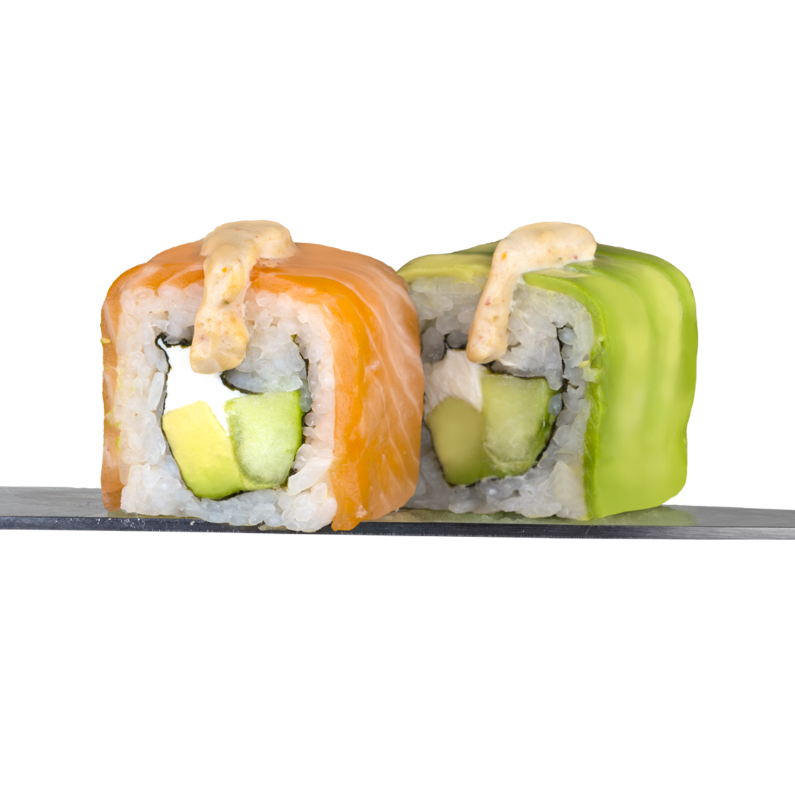 10 pzas. XD: Aguacate, pepino y queso crema XF: Salmón, aguacate y spicy yuzu mayo.