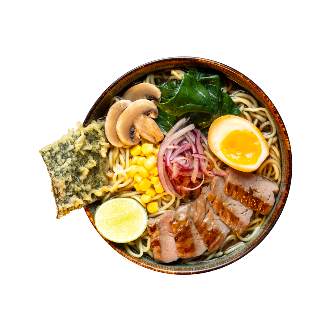 a) Pasta udon, pollo thai (40 g), elote, champiñón y zanahoria. b) Bebida a seleccionar: Calpis (natural, fresa o naranja) o Limonada (limón c/ chía, fresa - limón, blueberry o frutos rojos).