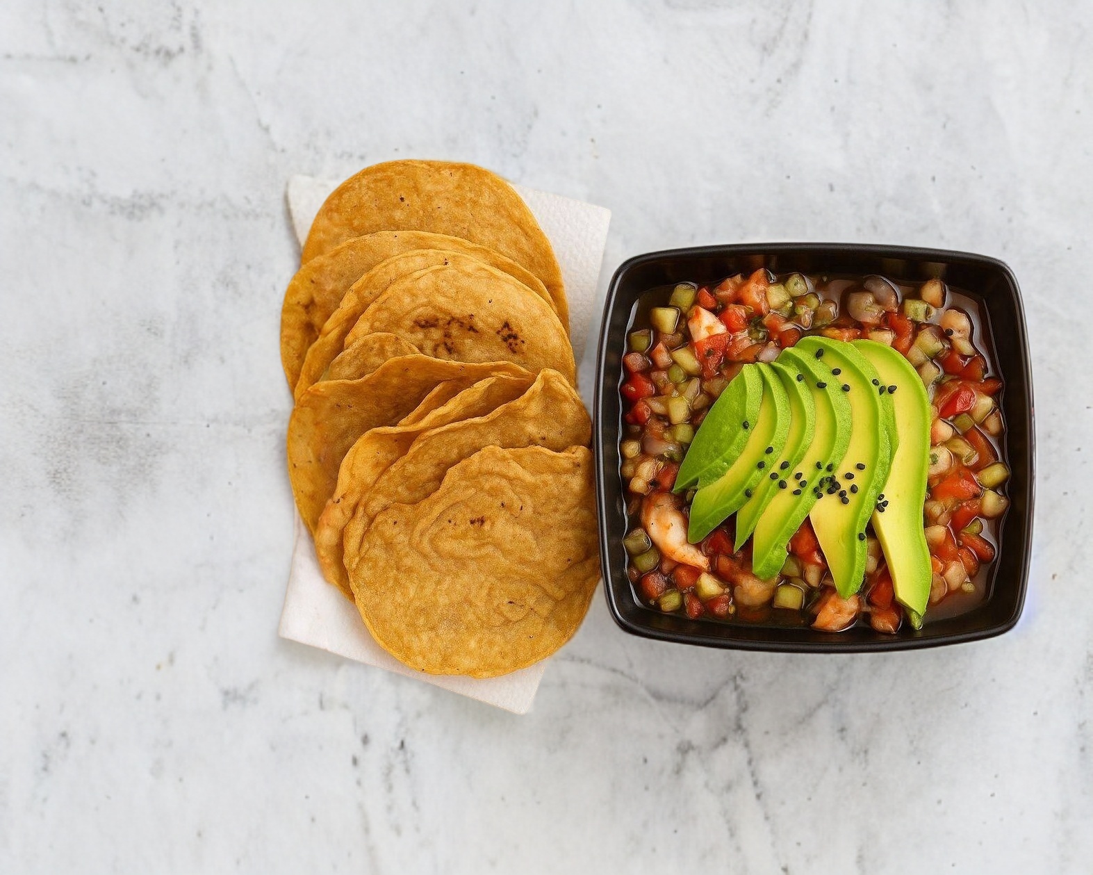 200 g, Camarón crudo picado en cubos, jitomate, pepino, cebolla morada, clamato y salsas de la casa.