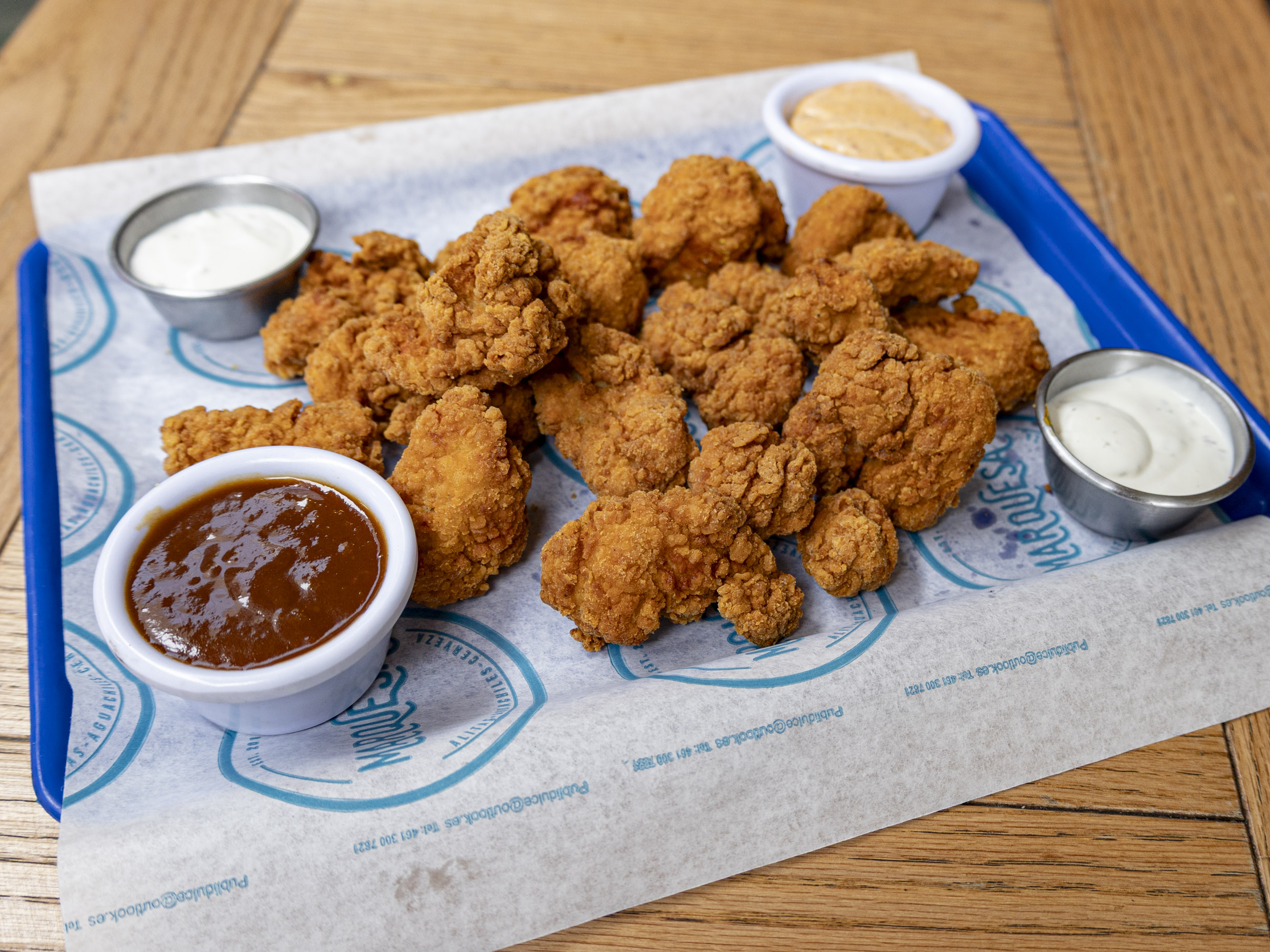 Camarón, salsa de la casa, cebolla morada, pepino, aguacate, jitomate y limón.