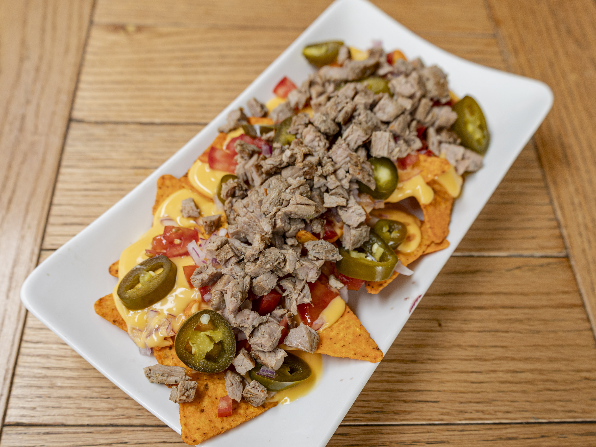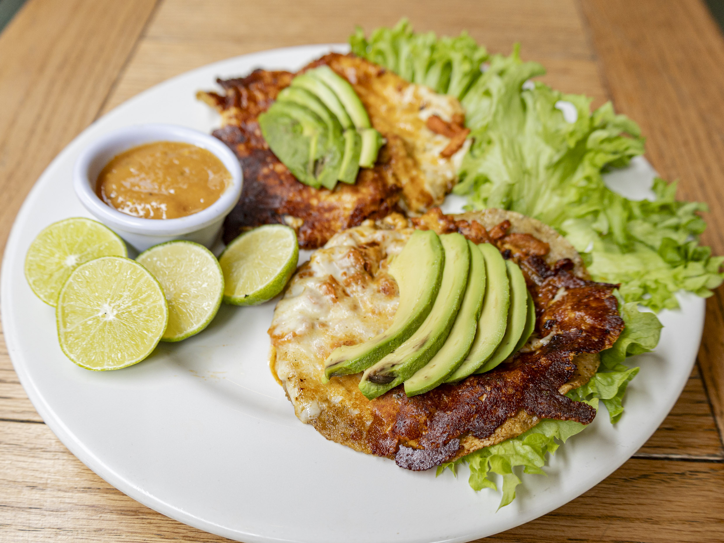 Pastor de trompo con una costra de queso Oaxaca coronado con aguacate