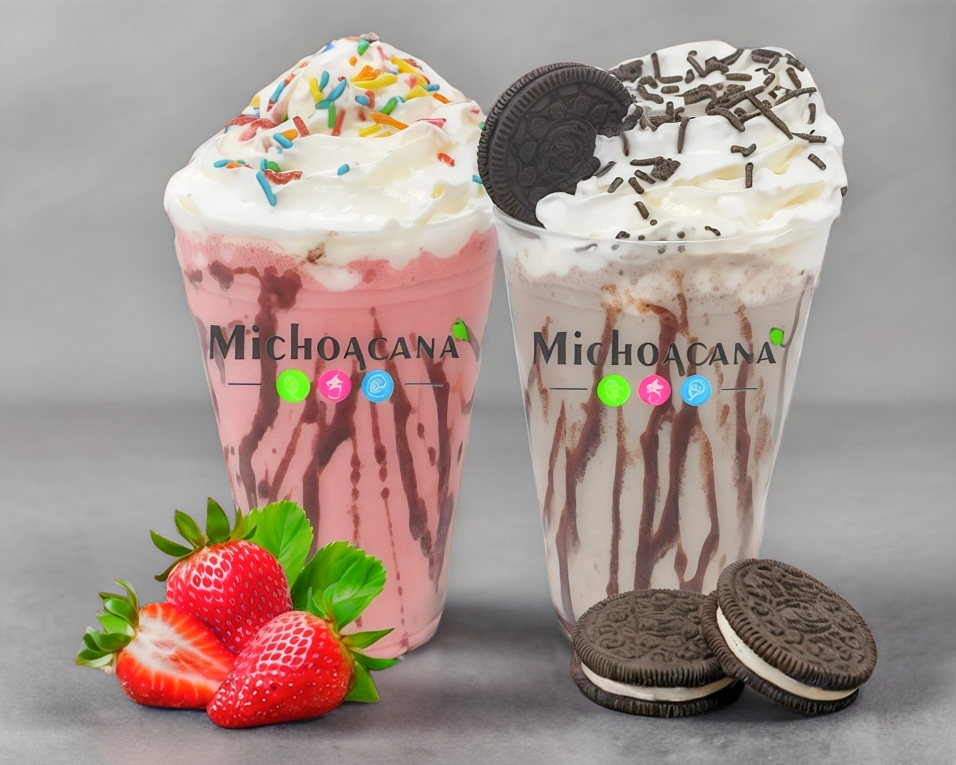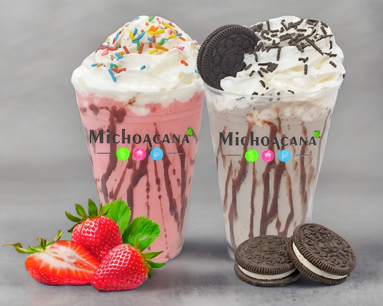 Bebida a base de leche entera, helado, azúcar, vainilla, canela, toque de crema batida y chispas, decorado con chocolate o mermelada de fresa.