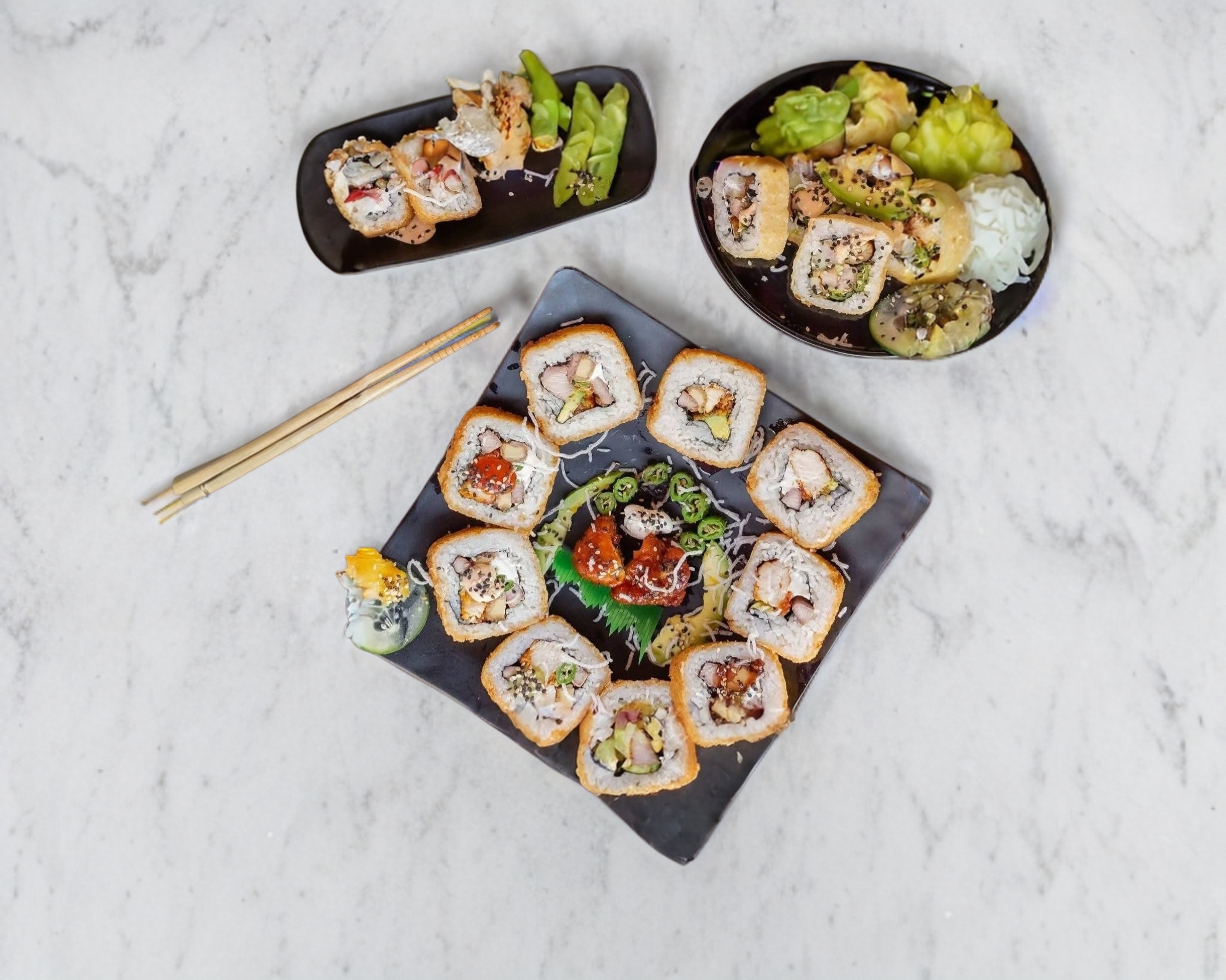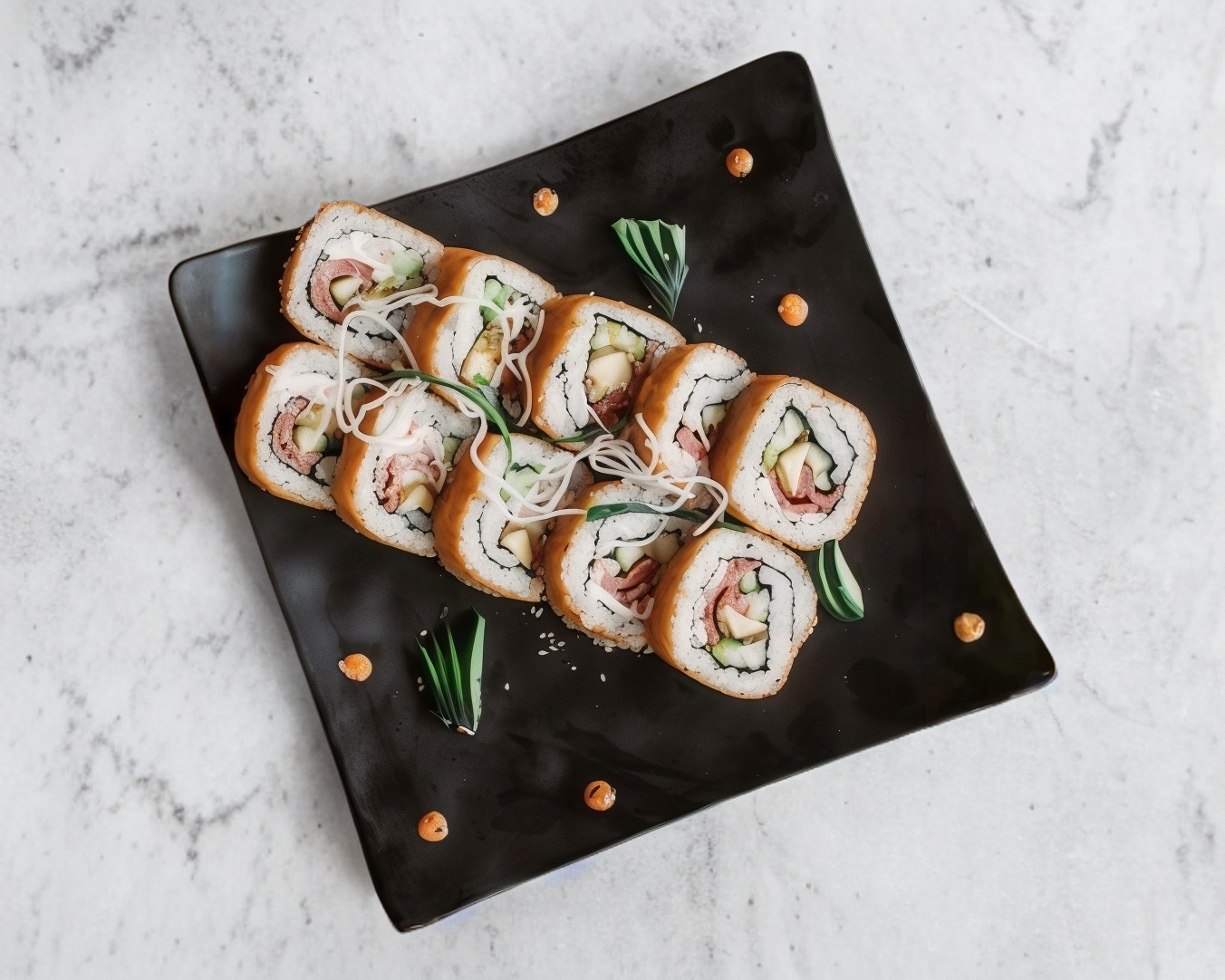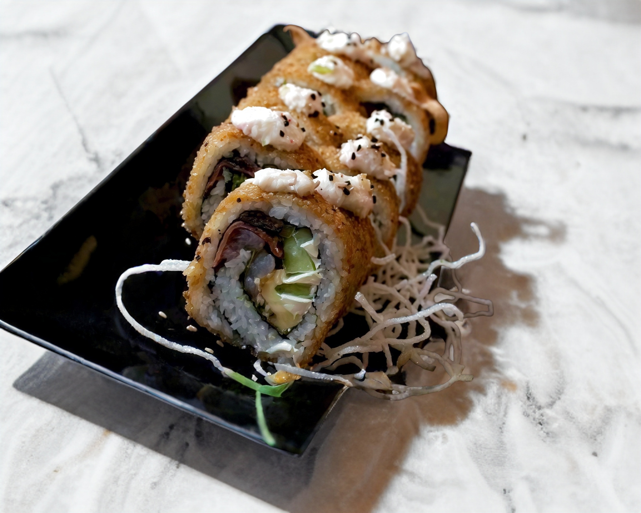 Queso crema, camarón, arrachera, aguacate, kushiage, chile toreado y pepino. Por fuera envuelto en pasta harumaki. ¡No es cualquier sushi, es Miyamoto!