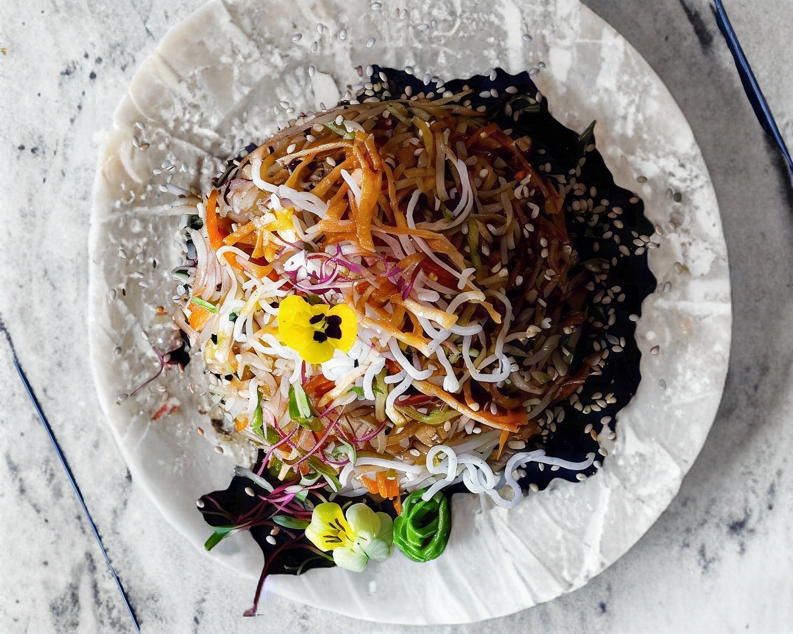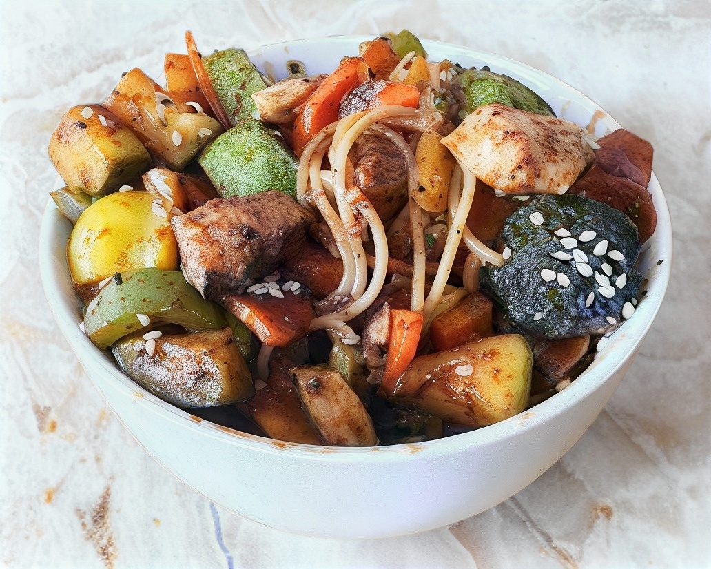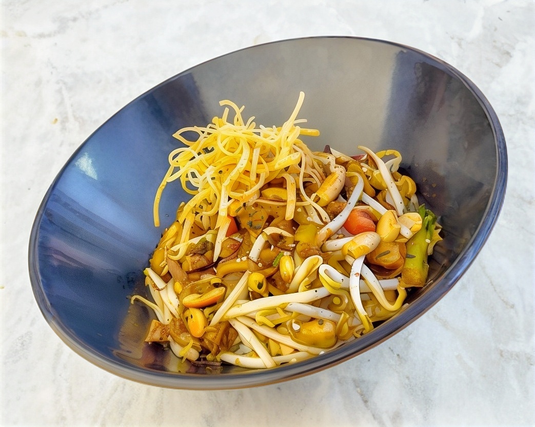 Mix de verduras salteadas (morrón, calabaza, zanahoria, champiñón, brócoli), pollo, arrachera, camarón. Con cama de arroz o spaghetti.