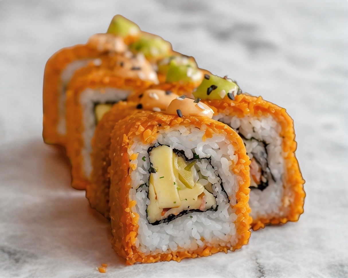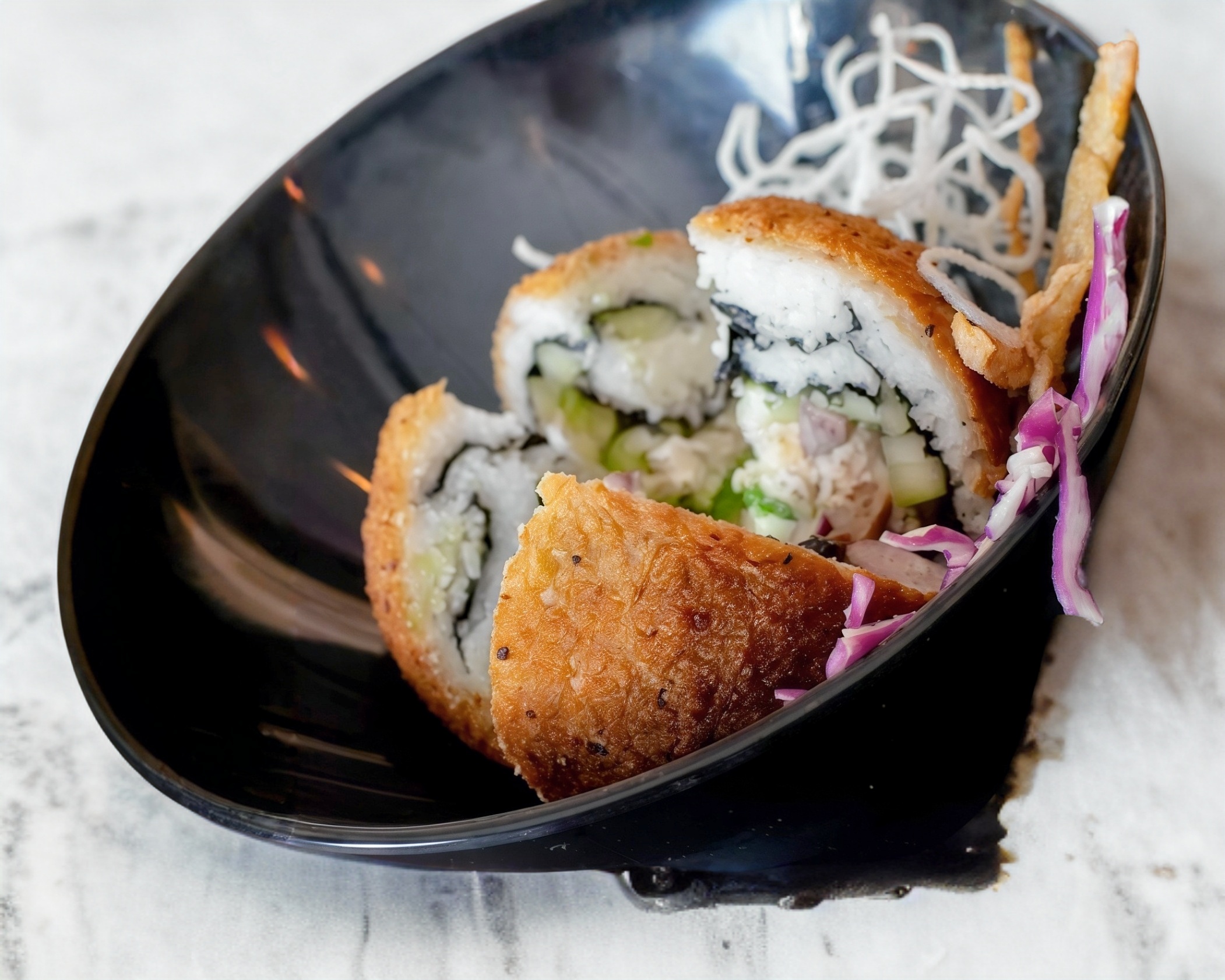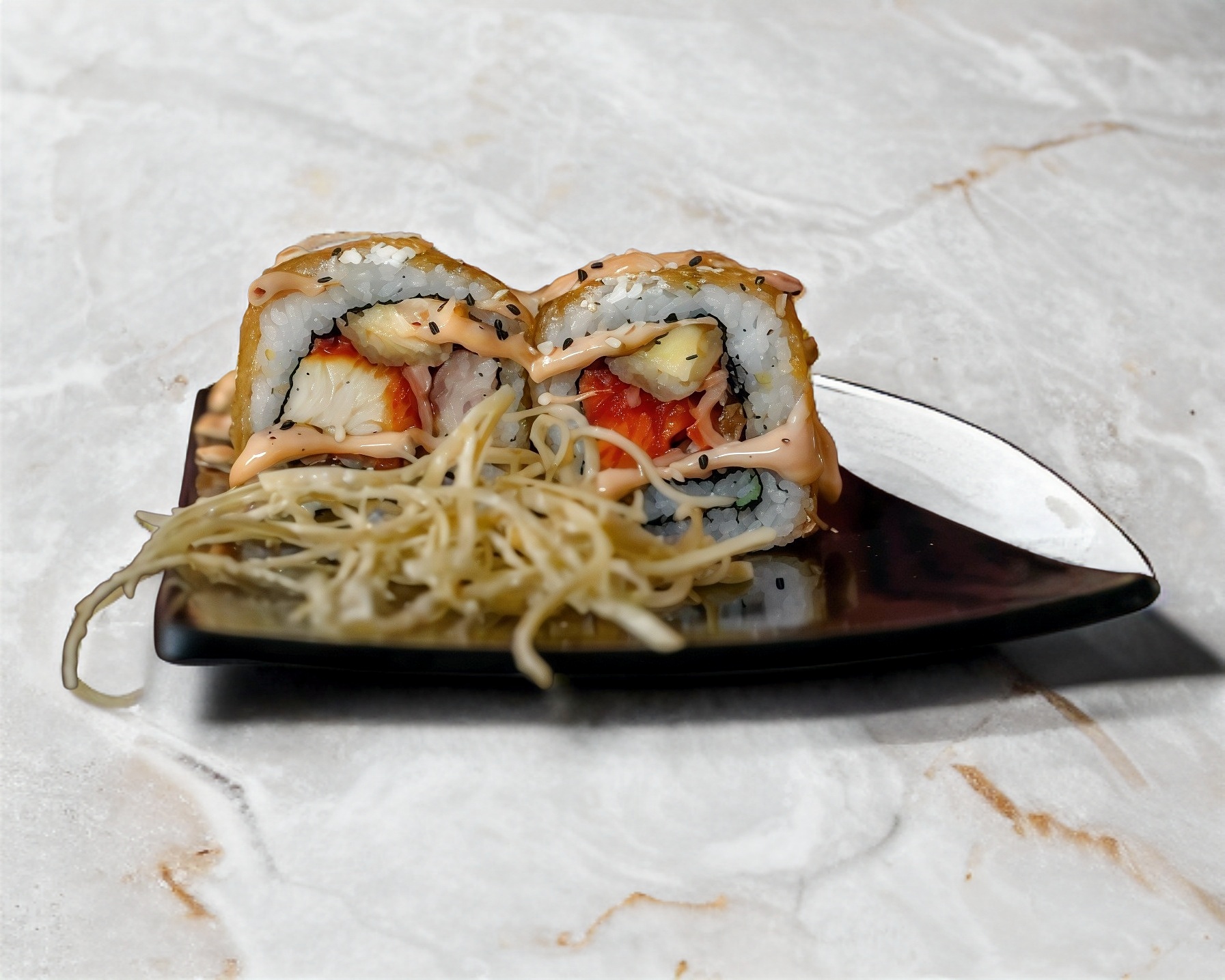 Bola de arroz rellena de camarón tempura, pollo tempura, queso crema, cebolla caramelizada, aguacate y pepino. Envueltos en pasta harumaki. ¡#KaijusMiyamoto! ¡No es cualquier sushi, es Miyamoto!