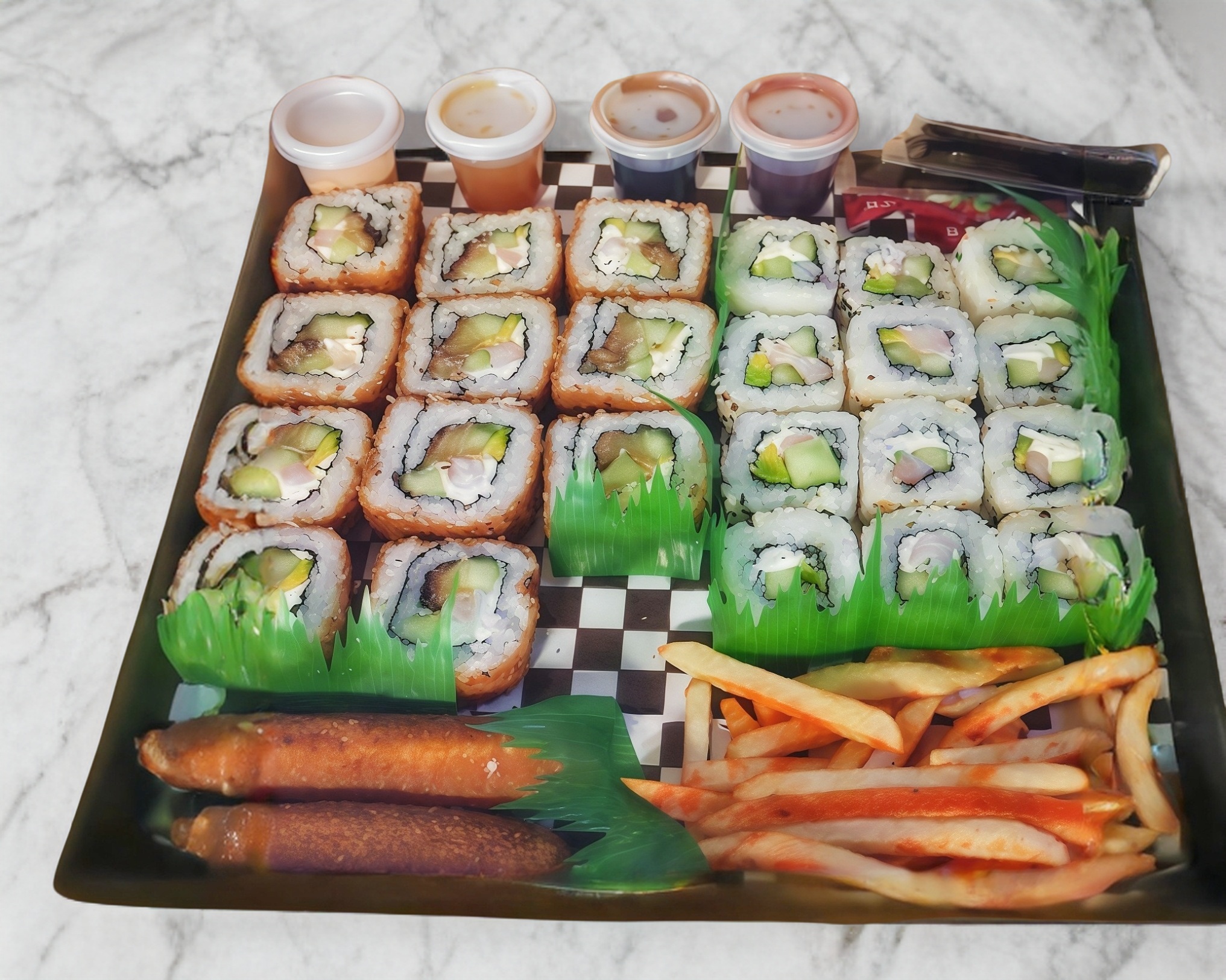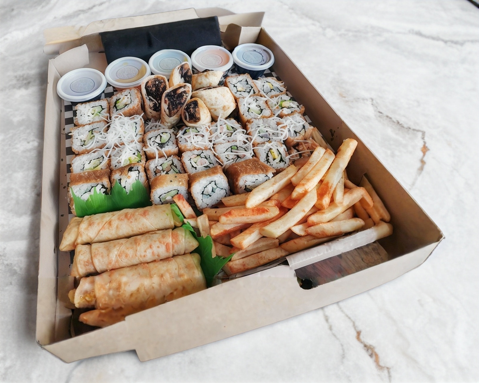 1 Rollo especialidad + 1 rollo normal + 1 complemento + papas. ¡Perfecto para 1-2 personas!