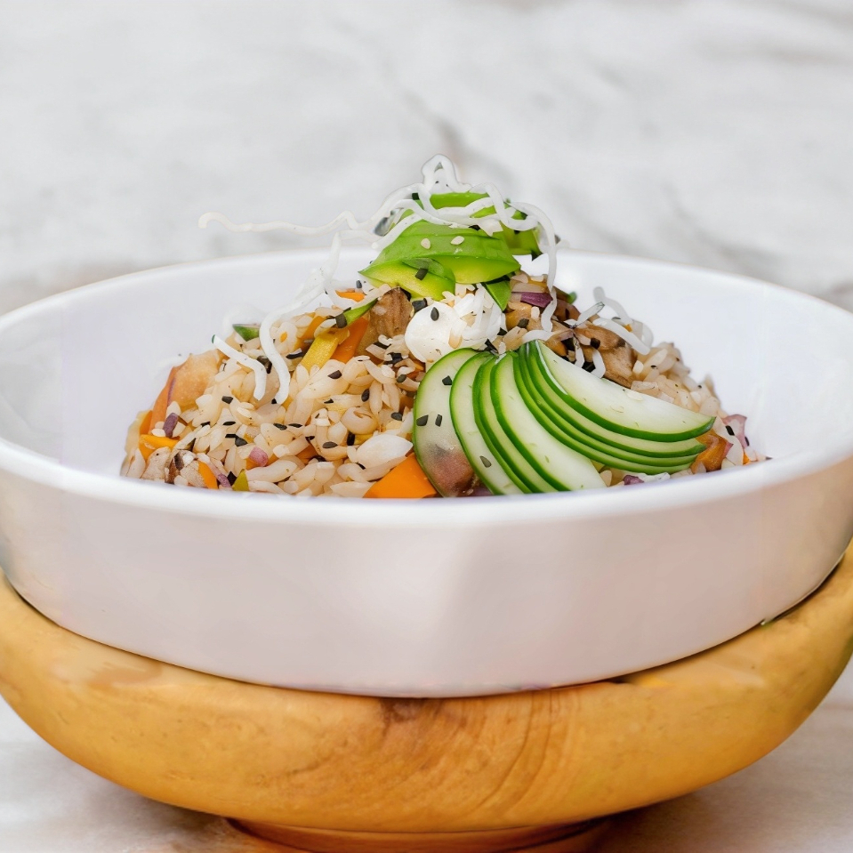 Arroz frito con verduras, camarón, pollo, arrachera, aguacate, queso crema y salsa Tampico. ¡#MiyamotoSushi! ¡Explosión de sabor!