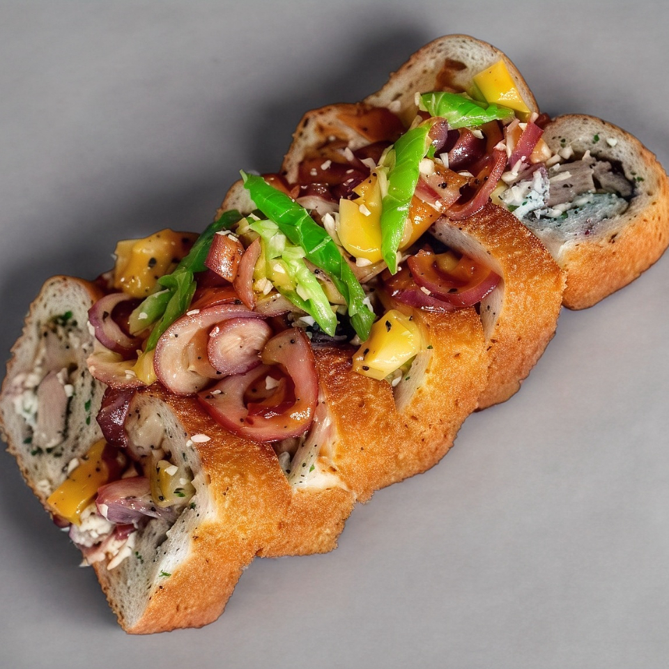 Bola de arroz rellena de queso crema, chiles toreados, pepino, aguacate, arrachera y pollo. empanizado.