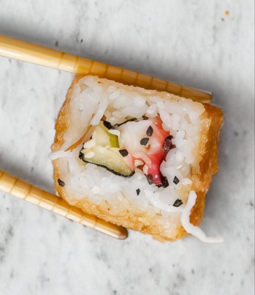 Queso crema, camarón, arrachera, aguacate, kushiage, chile toreado y pepino. Por fuera envuelto en pasta harumaki. ¡No es cualquier sushi, es Miyamoto!