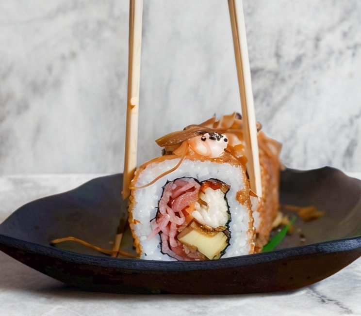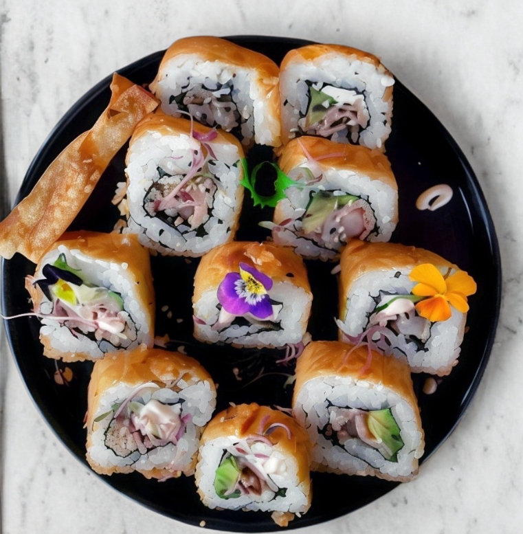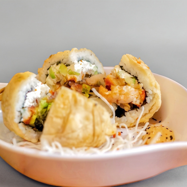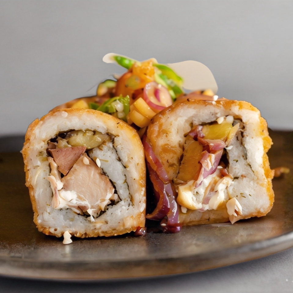 Bola de arroz rellena de camarón tempura, pollo tempura, queso crema, cebolla caramelizada, aguacate y pepino. Envueltos en pasta harumaki. ¡#KaijusMiyamoto! ¡No es cualquier sushi, es Miyamoto!