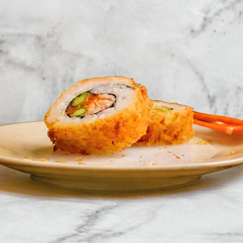 Queso crema, camarón, kushiage, pepino y aguacate. Empanizado. ¡No es cualquier sushi, es Miyamoto!