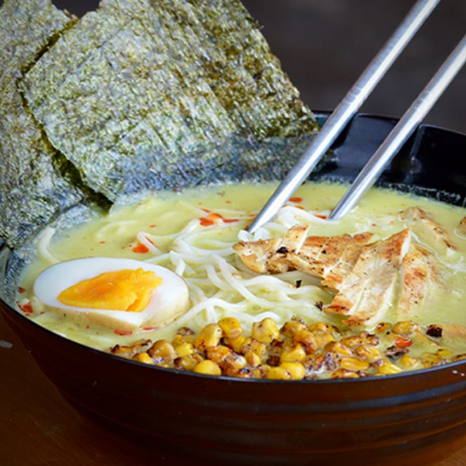 Relleno de aguacate y camarón, con topping de tampico de esquite y chile jalapeño
