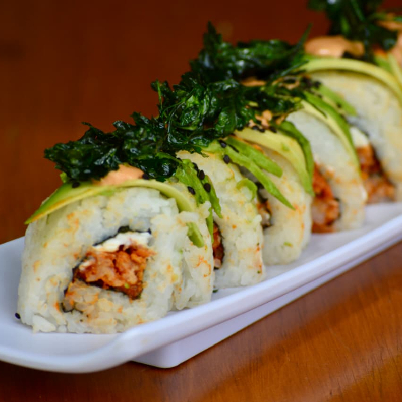 Relleno de queso, pepino, aguacate y arrachera, envuelto en salmón y atún, con topping de kakiagey miel de agave spicy