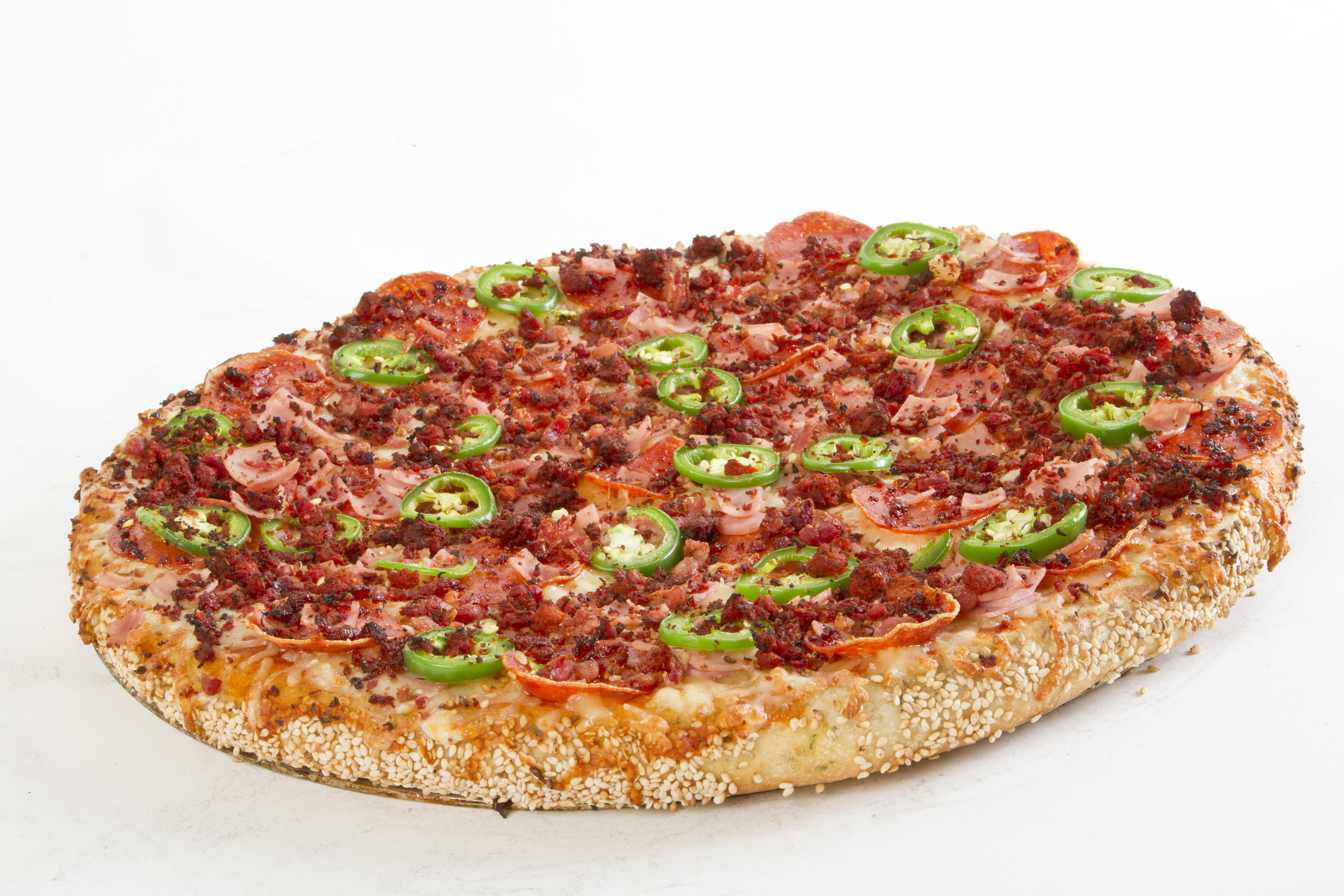 Pizza familiar de 12 rebanadas con peperoni, jamon, tocino, chorizo y chile toreado