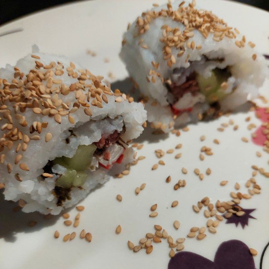 1 Delicioso Rollo De Sushi Partido Por La Mitad, Alga , Arroz , Pepino , Aguacate , Surimi