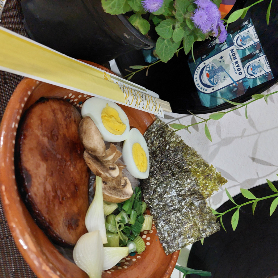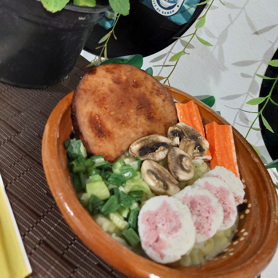 Ramen Yuan Hecho A Base Caldo Casero Con Soya , Fideo Chino De Frijol Mungo , Guarnición De Cebolla , Champiñones , Huevo Cocido , Alga Deshidratada, Narutomaki, Chuleta Caramelizada, Surimi ) 🍜🍥