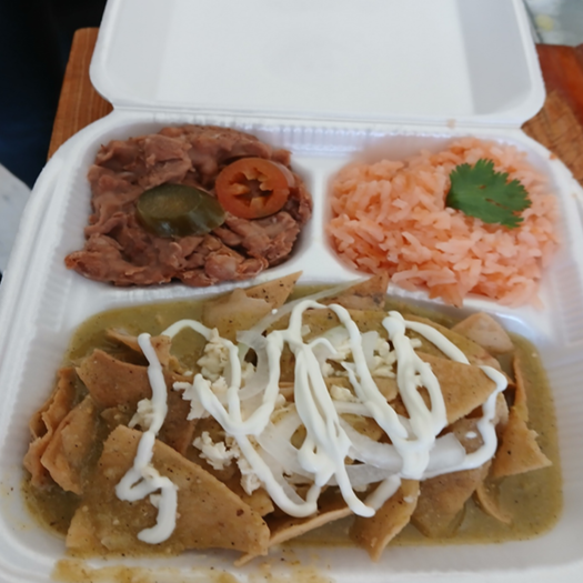 1 bolillo, salsa verde, arroz, frijoles, crema, queso, cebolla