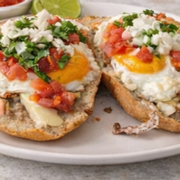 1 bolillo, salsa verde, arroz, frijolitos, cebolla, queso asadero, crema,