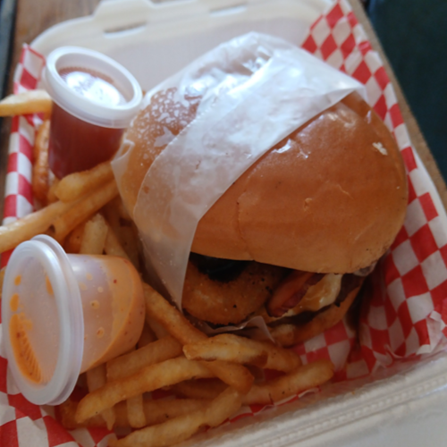 2 carnes de res, queso americano, queso asadero, 3 aros de cebolla, picante, salsa BBQ