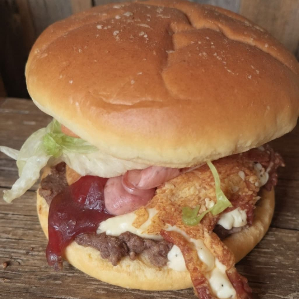 2 carnes de res, BBQ, queso americano, tocino, lechuga, jitomate, cebolla, picante