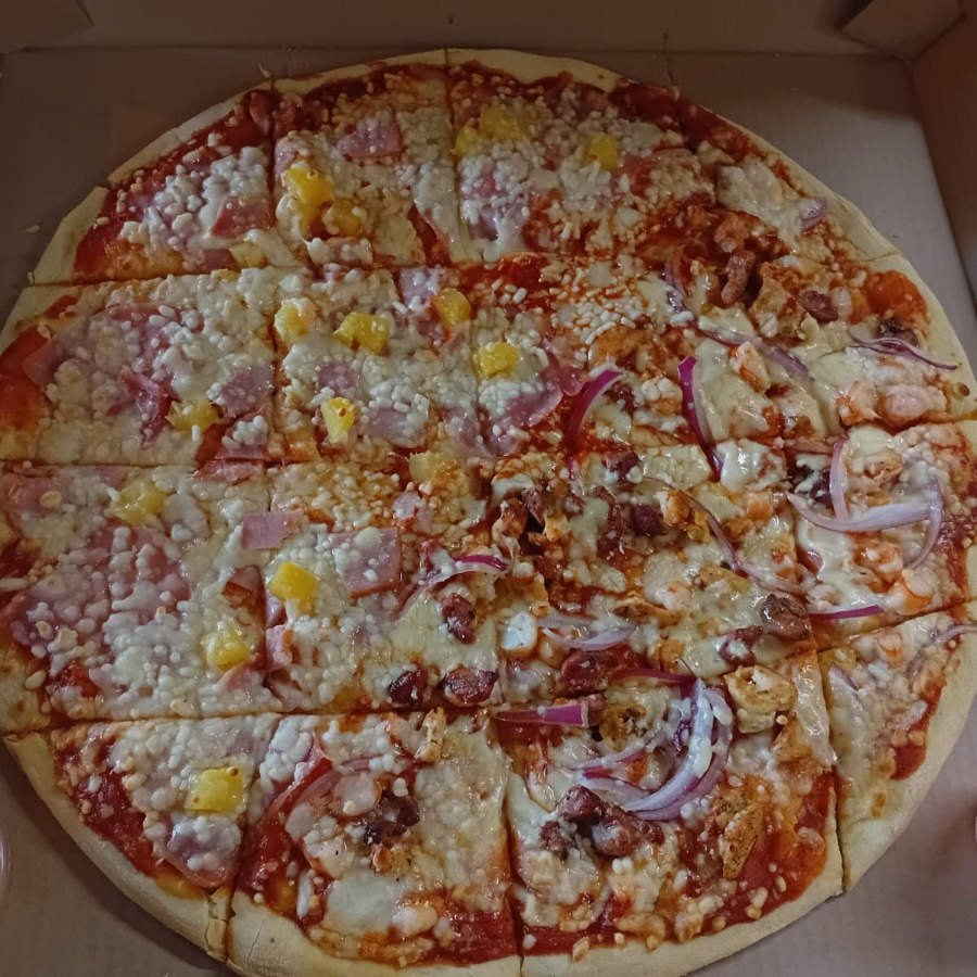 Clásico dulce y salado con trozos de jamón, tocino y jugosa piña.
