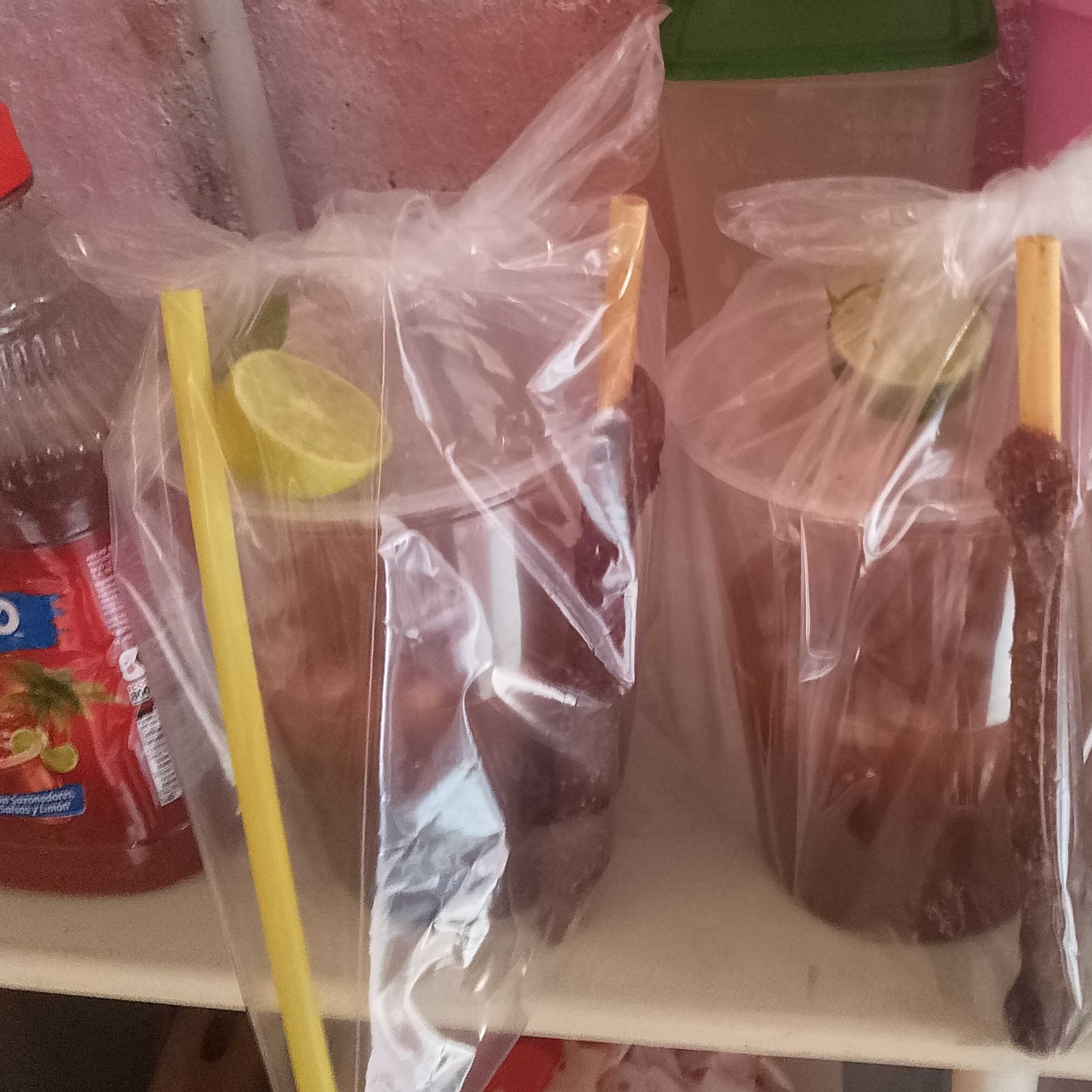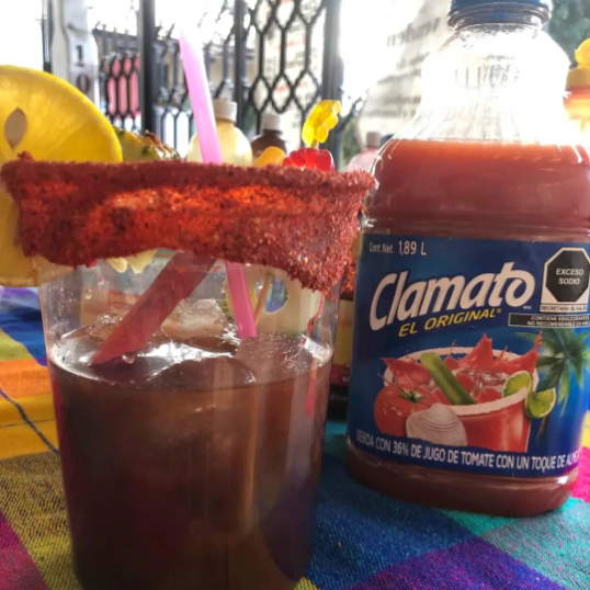 Preparado para bebida michelada con Clamato, salsas, limón sal ..... Vaso para litro